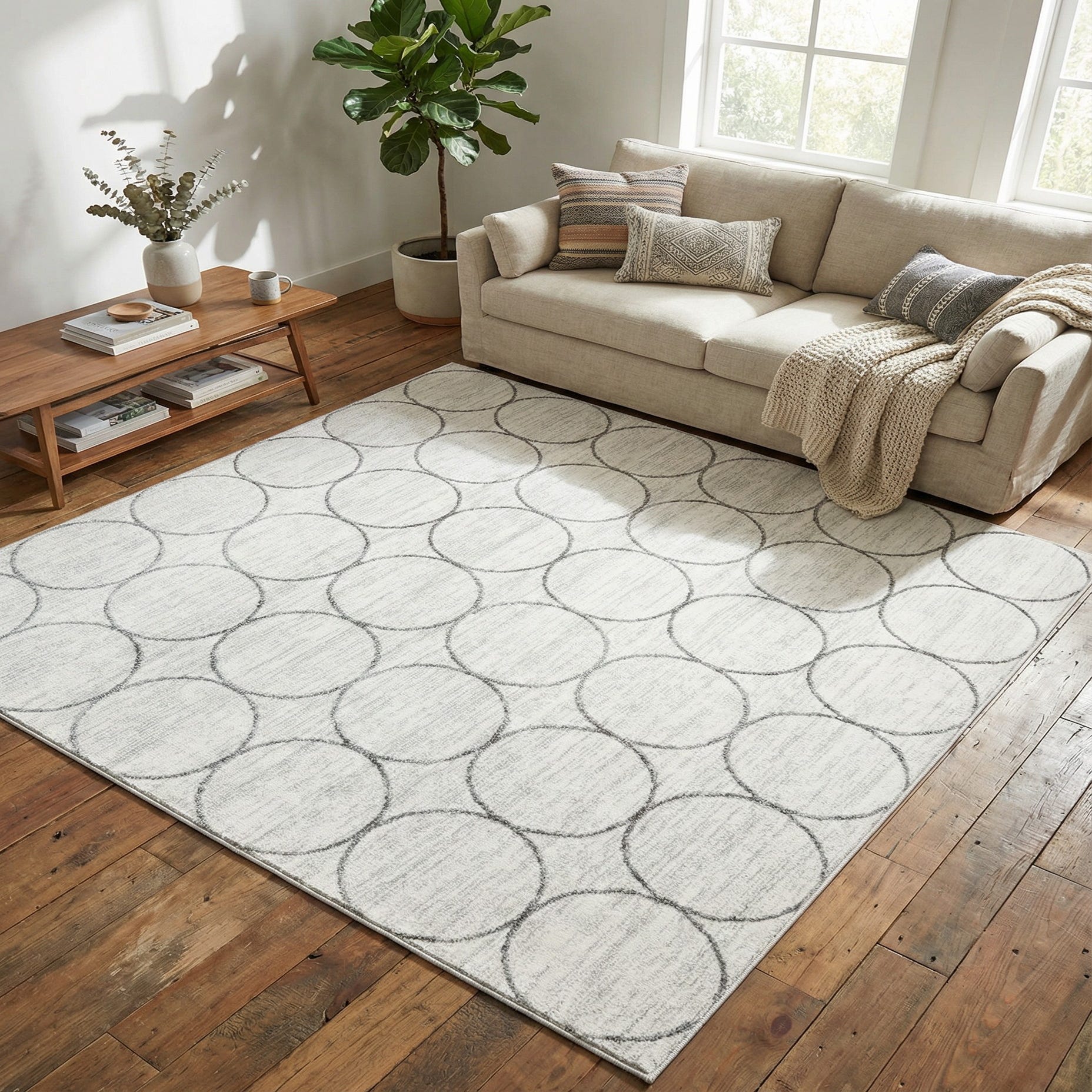 Primary color is White. Colors in this rug include: White, Gray.