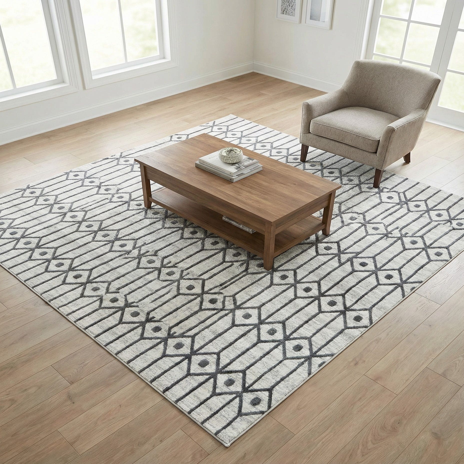 Place this rug to anchor a living-room seating area or beneath a coffee table to introduce pattern without overpowering the space. It also works well in a home office or bedroom where a neutral palette and linear design can complement wood tones, black metal accents, or textured textiles. The white and gray colorway pairs easily with cool blues, warm neutrals, or a single bright accent for a refined, contemporary feel.