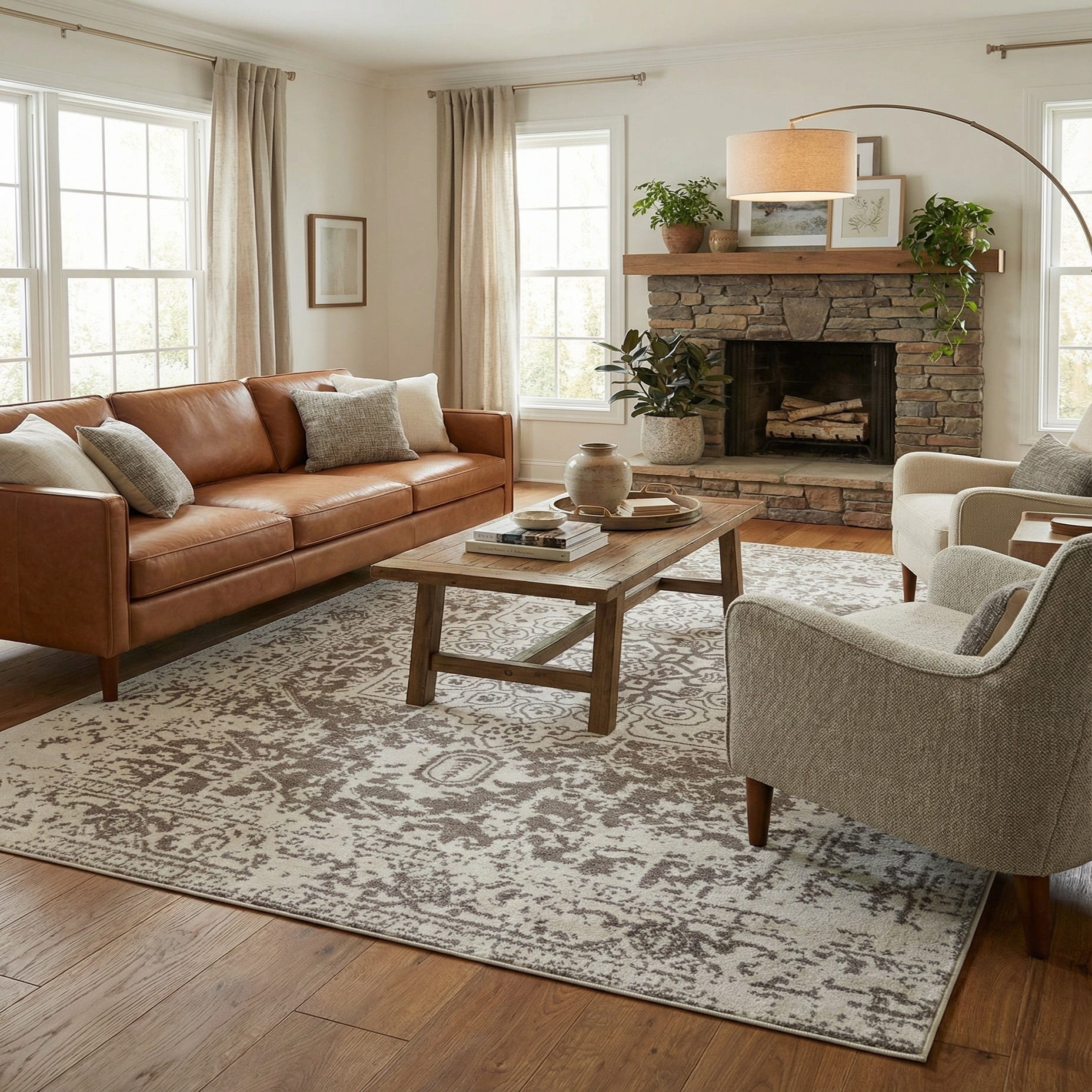 A 7x10 rectangular white and gray traditional medallion rug with a distressed vintage look, suitable for a living room.