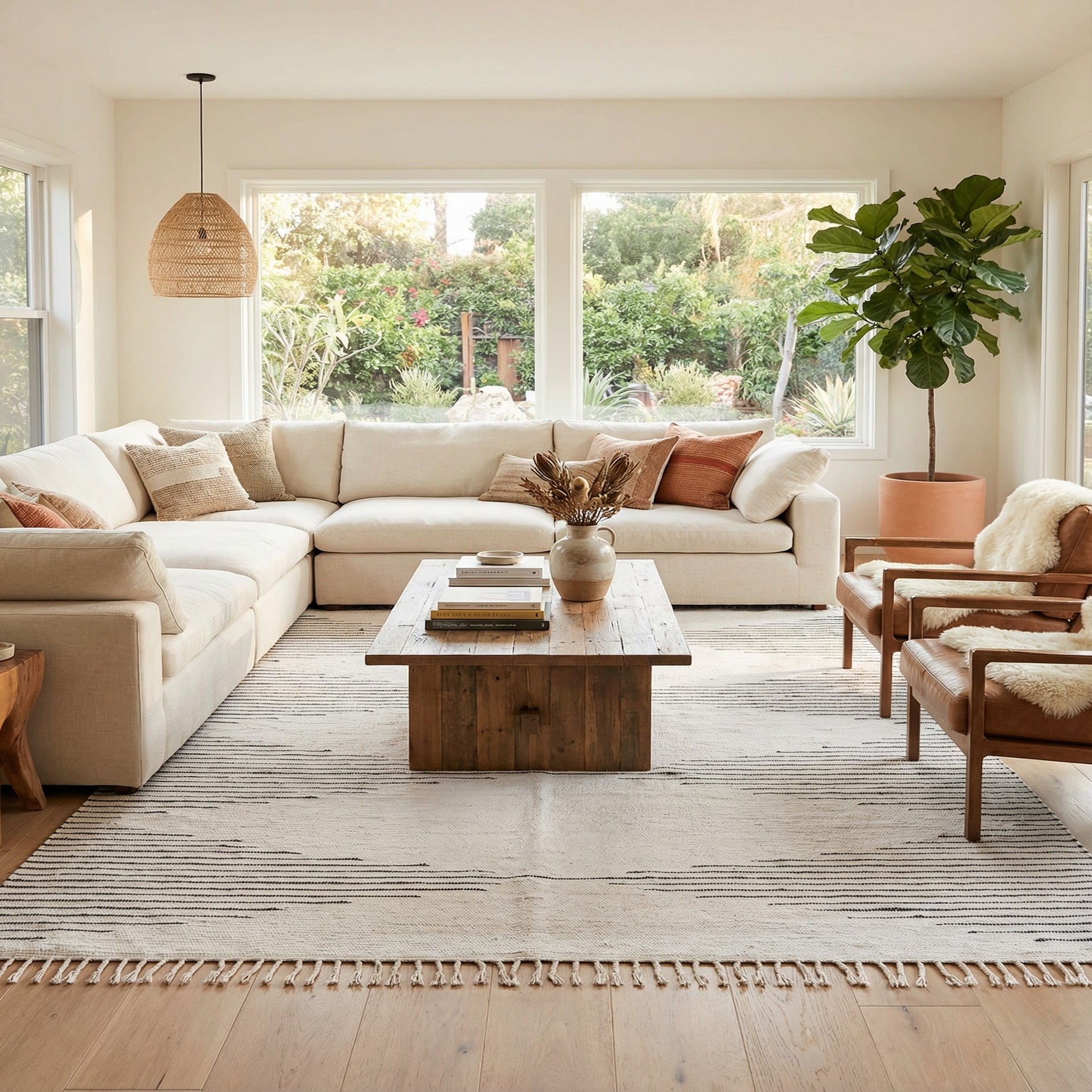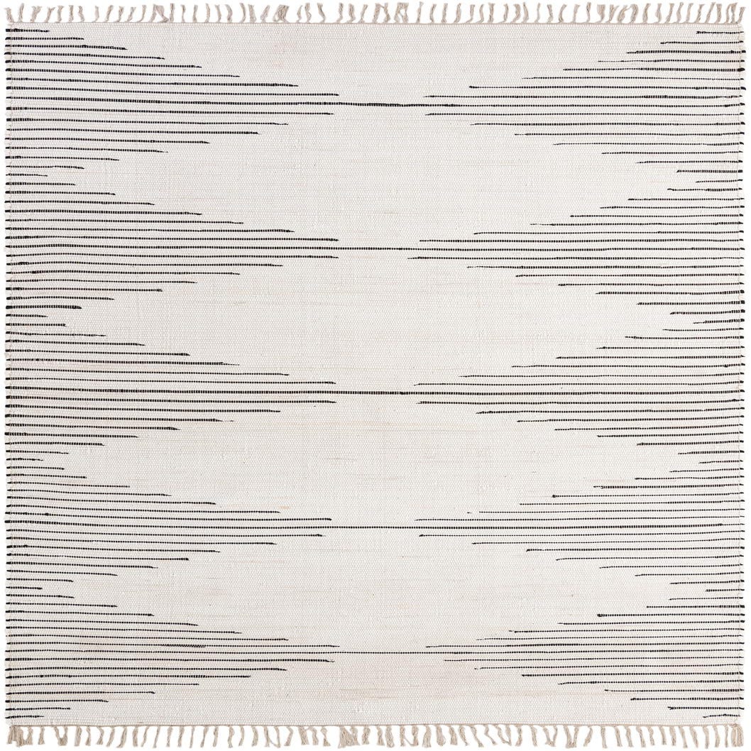A 7x10 rectangular white cotton flatweave rug with a modern black stripe pattern and fringed edges.