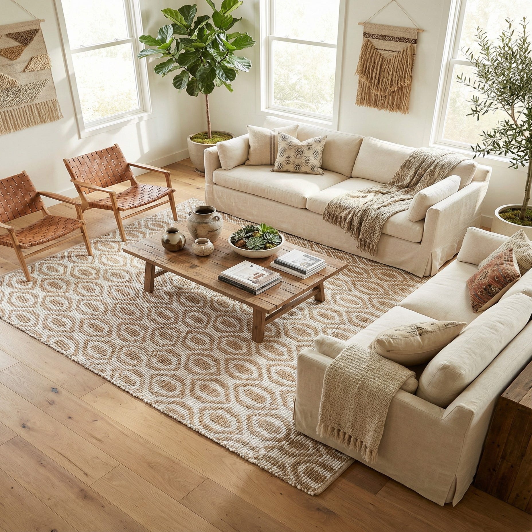 Pair this rug with light wood furniture, linen-upholstered seating, and woven accents for a relaxed coastal or modern farmhouse look. It also complements Scandinavian and casual contemporary interiors, working well under a coffee table in the living room, layered at the foot of a bed, or anchoring a dining area where a neutral, textured base is needed.