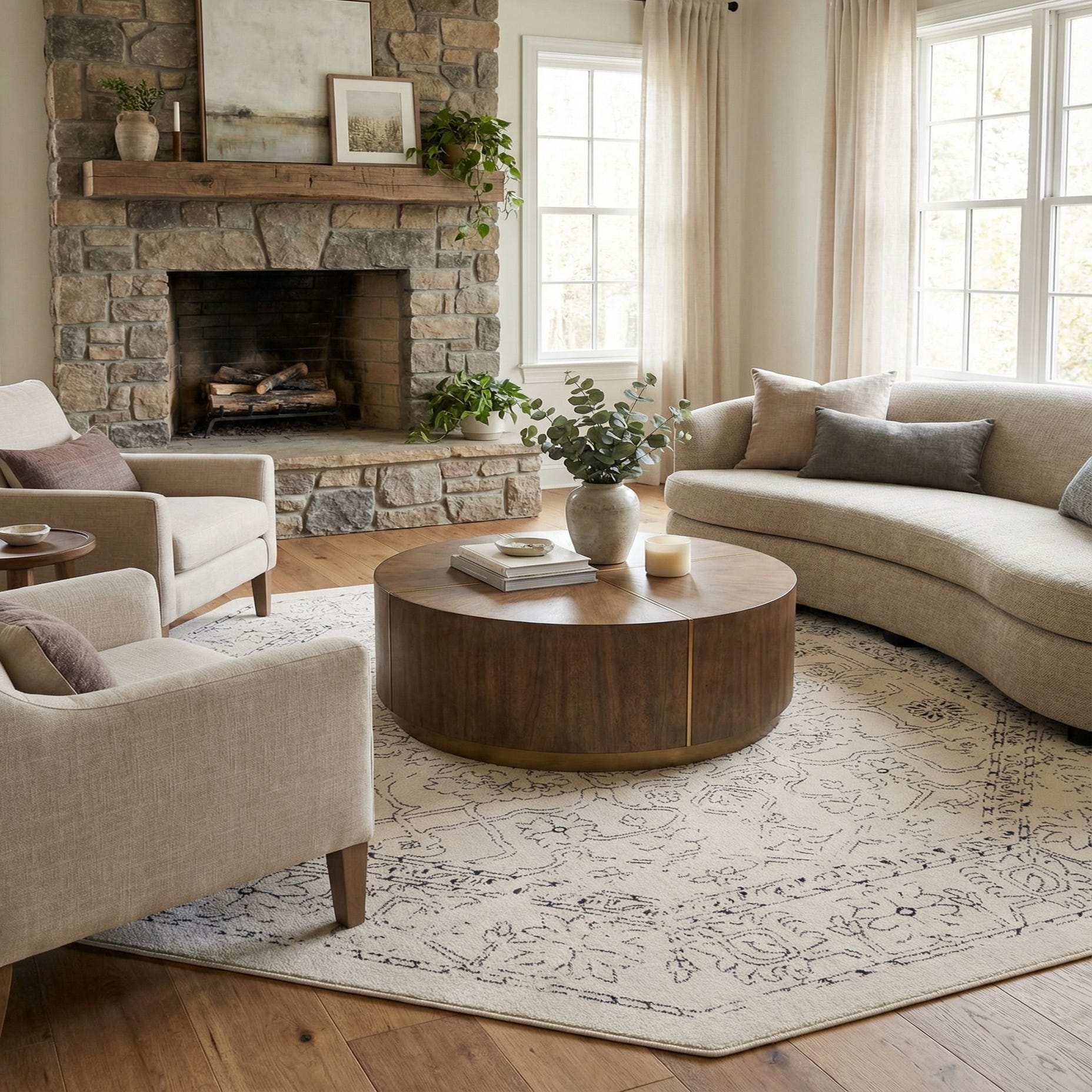 An octagonal white area rug with a faded black traditional medallion and floral pattern, featuring a textured high-low pile.