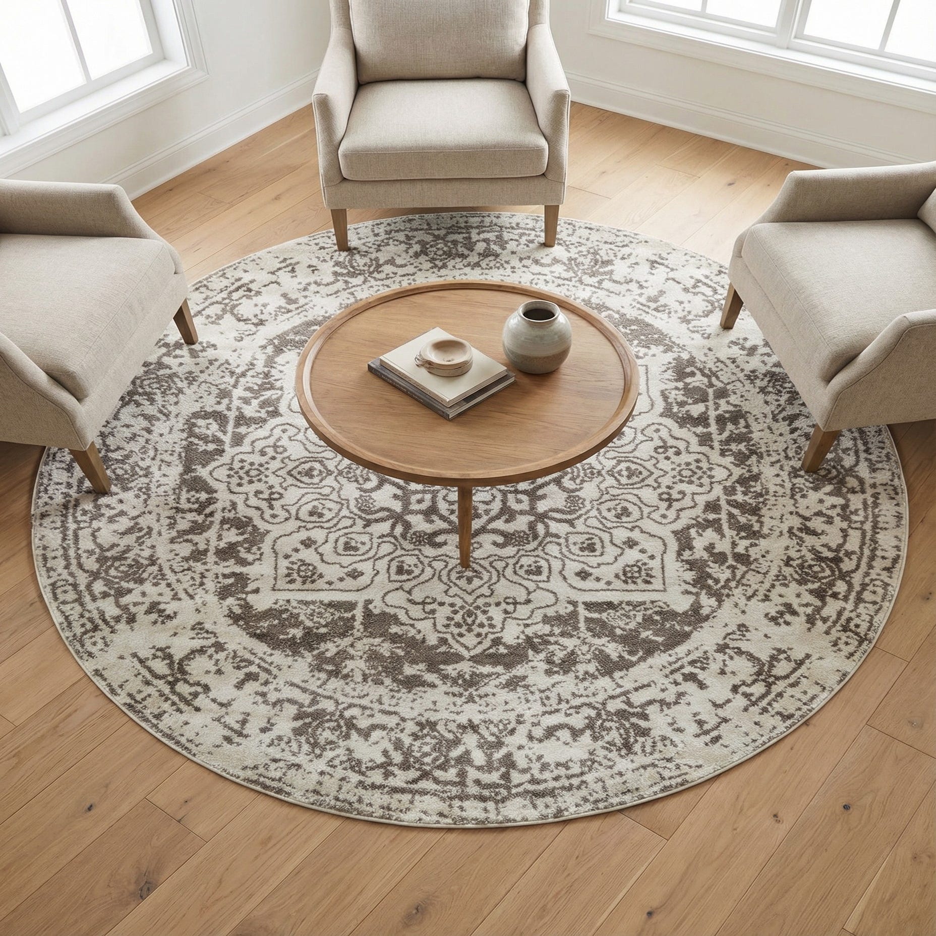 A soft white field sets the stage for a classic medallion motif in warm gray, rendered with a gently distressed, vintage-inspired look. The round shape centers an ornate, symmetrical pattern with worn-edge detailing that gives the rug character without overwhelming a room. Machine made from 100% polypropylene, it has a low, slightly dense pile with a subtle raised texture where the design sits, so you can feel the pattern underfoot while the surface stays smooth and even.