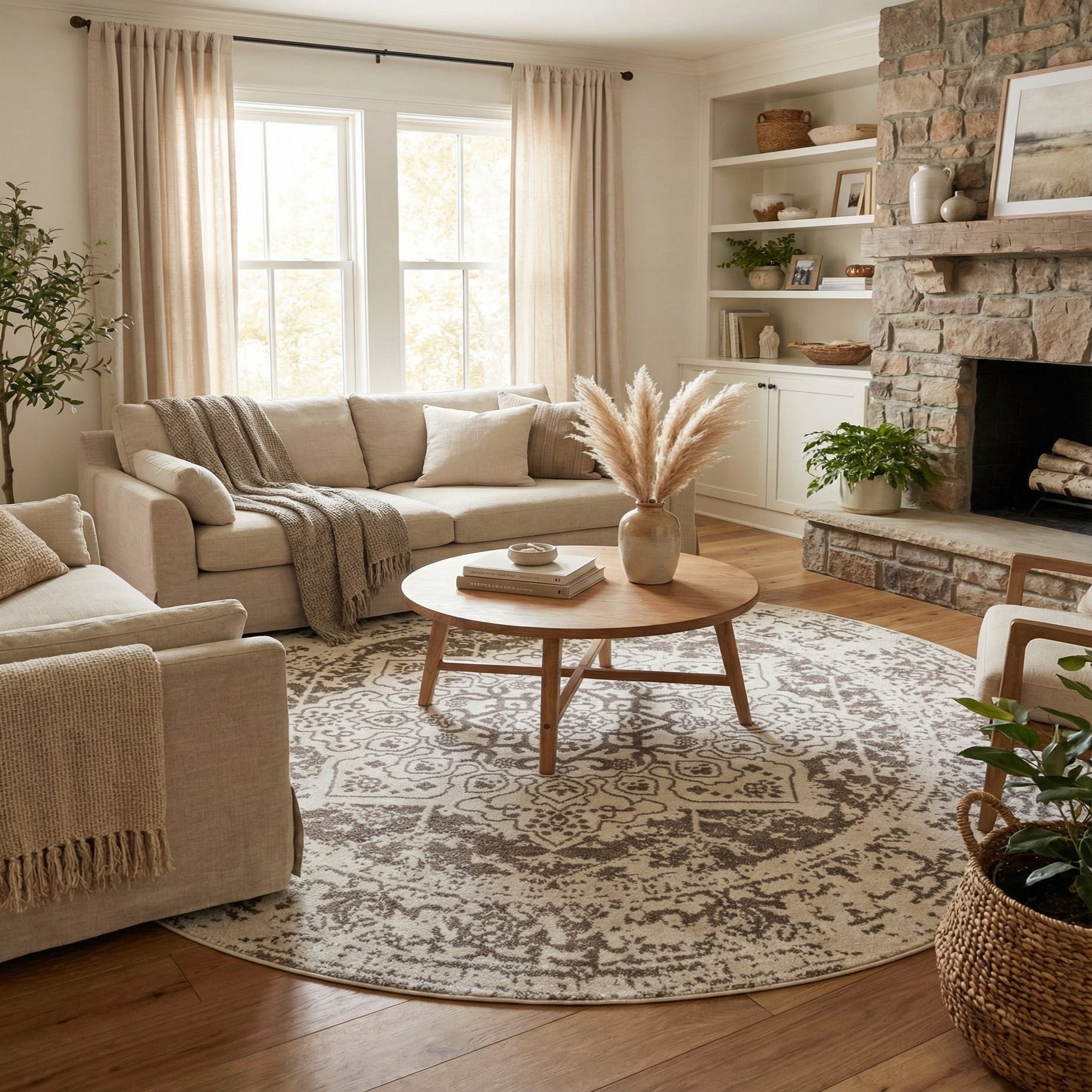 This rug works well as an anchor for a round dining table, a cozy seating area, or beneath a bed in a neutral bedroom. Its muted white-and-gray palette pairs easily with light woods and natural fibers for a coastal or Scandinavian look, complements weathered finishes in a farmhouse setting, and provides a soft contrast against darker modern furnishings in transitional interiors.