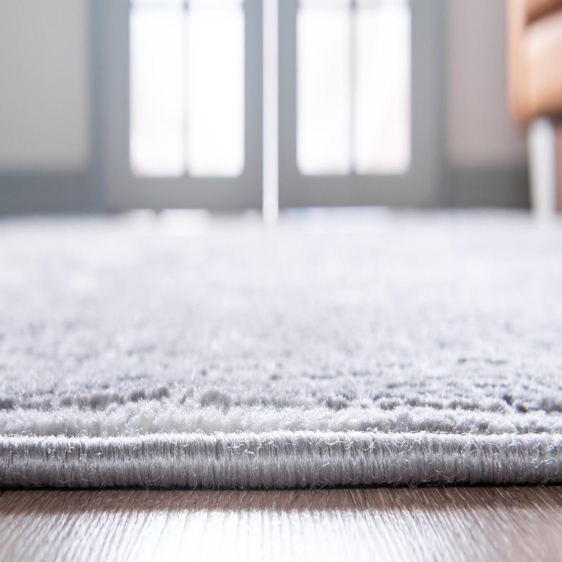 A classic medallion design centers this round rug, surrounded by concentric floral and vine borders that create a refined, antique-inspired look. The pattern is rendered in soft gray on a clean white ground, providing a calm, neutral contrast that reads both traditional and updated. Machine made from a 55% polypropylene and 45% polyester blend, the rug has a low, dense pile with a smooth hand that highlights the pattern’s fine detail while offering a comfortable underfoot feel.