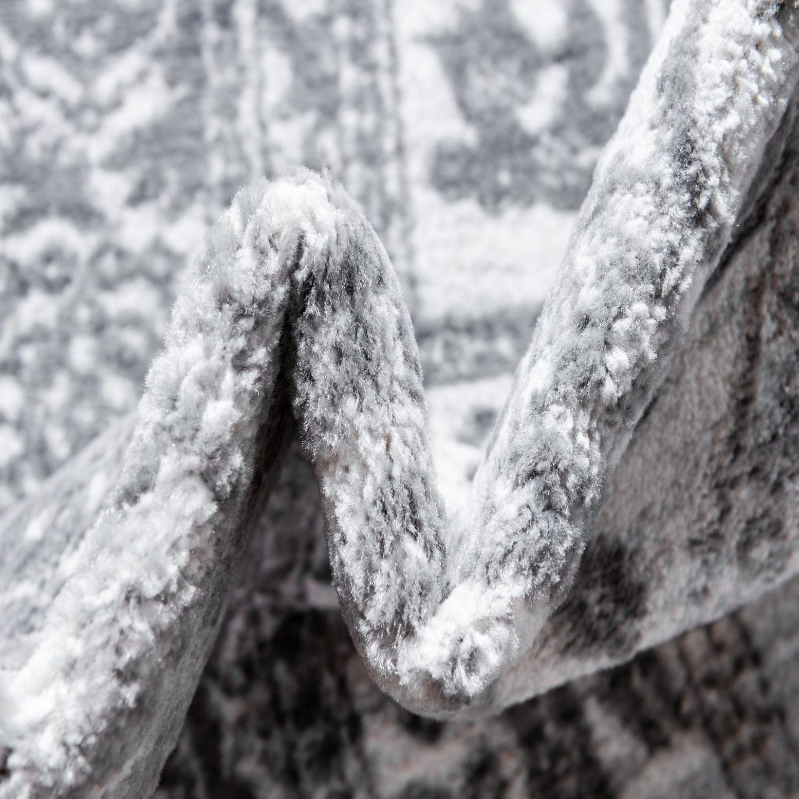 This rug works well beneath a round dining table to define the eating area, as an anchor for a small seating group, or layered under a bedside vignette to add pattern without overpowering the room. Its white-and-gray palette pairs easily with light woods, painted finishes, and textured linens, fitting into Scandinavian, transitional, coastal, and modern farmhouse interiors.