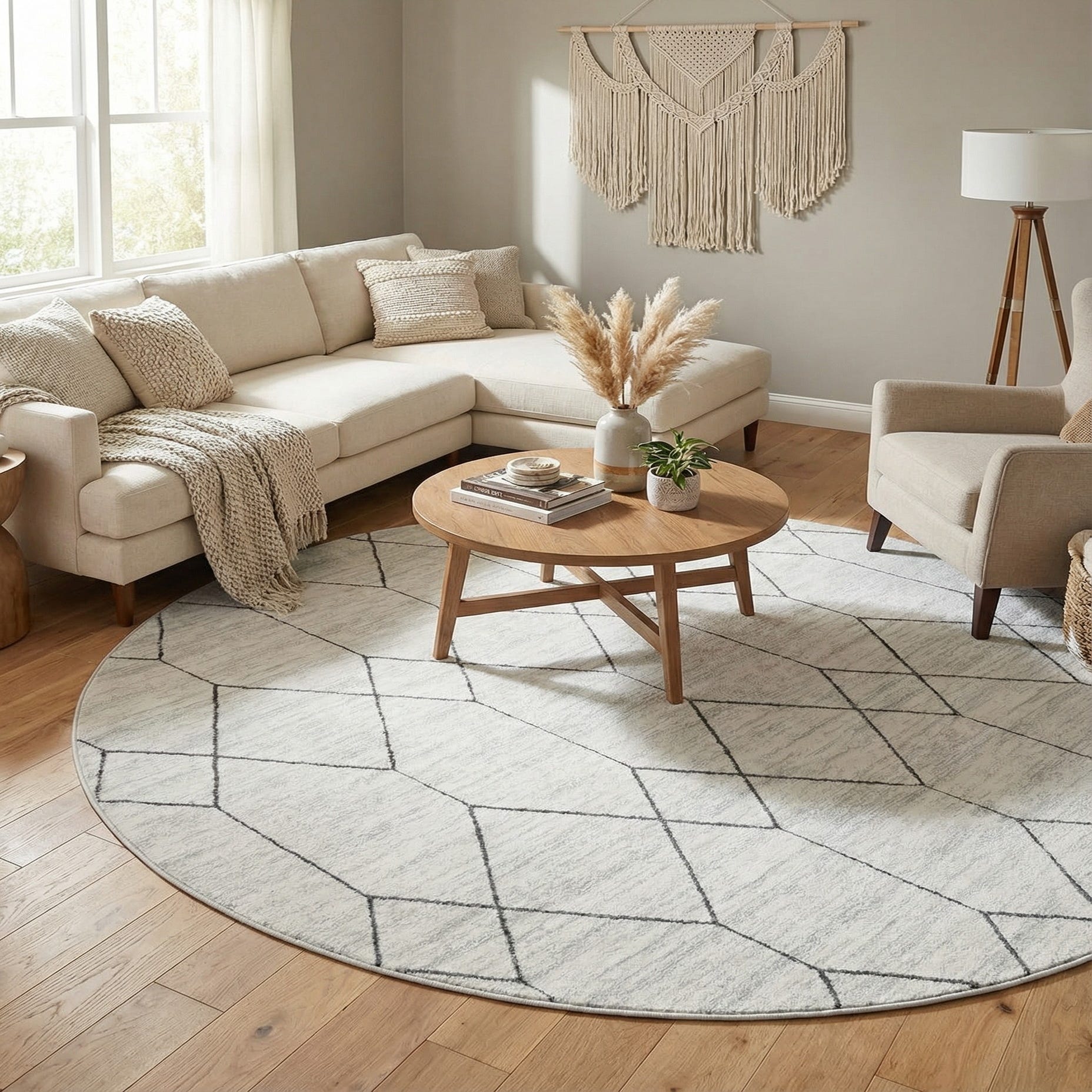 This rug works well in modern, Scandinavian, or transitional interiors — place it beneath a round dining table to define the eating area, center it in a living room to anchor a circular seating arrangement, or use it in a bedroom to add a light, airy layer beneath the bed. Pair with natural wood furniture, cool metal accents, or muted upholstery to let the gray-and-white palette complement both minimalist and layered looks.