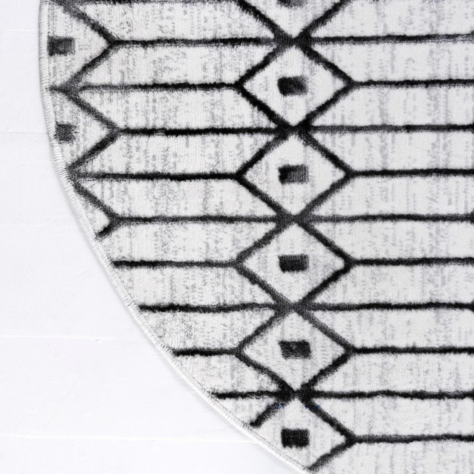 A round 8' white rug with a dark gray geometric trellis pattern, featuring small dots within the lattice design.