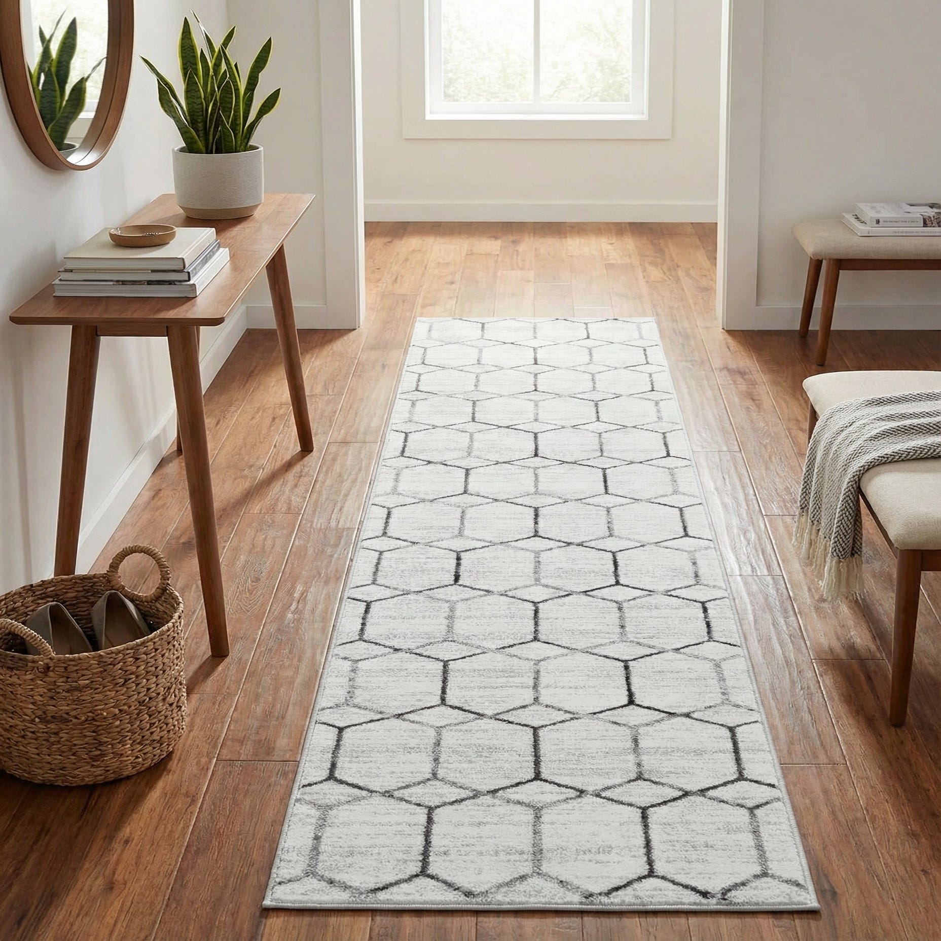 A clean white field sets the stage for a crisp geometric trellis rendered in soft gray lines, forming an elongated honeycomb pattern that moves rhythmically down the length of the runner. The machine-made construction in 100% polyester gives the surface a plush, velvety hand with a low-to-medium pile that feels soft underfoot while holding the pattern definition. Subtle variation in the gray shading adds depth and a slightly worn, lived-in look that keeps the overall impression light and refined.