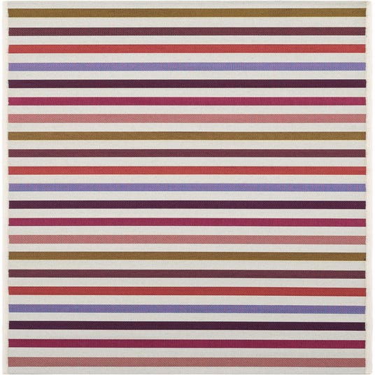 A modern 8 ft runner rug with horizontal stripes in white, purple, red, pink, and brown, suitable for a hallway or patio.
