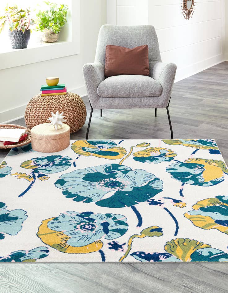 Bold, oversized floral motifs float across a clean white ground in a fresh, contemporary pattern. Petal shapes in light blue, teal, green, yellow, pink and navy are rendered with painterly edges and layered color blocking, giving the rug a lively, artful look without feeling busy. Machine made of 100% polypropylene, the surface has a soft, even pile that lays flat underfoot and gently defines the floral design, so the colors and details remain crisp while the texture stays comfortable.