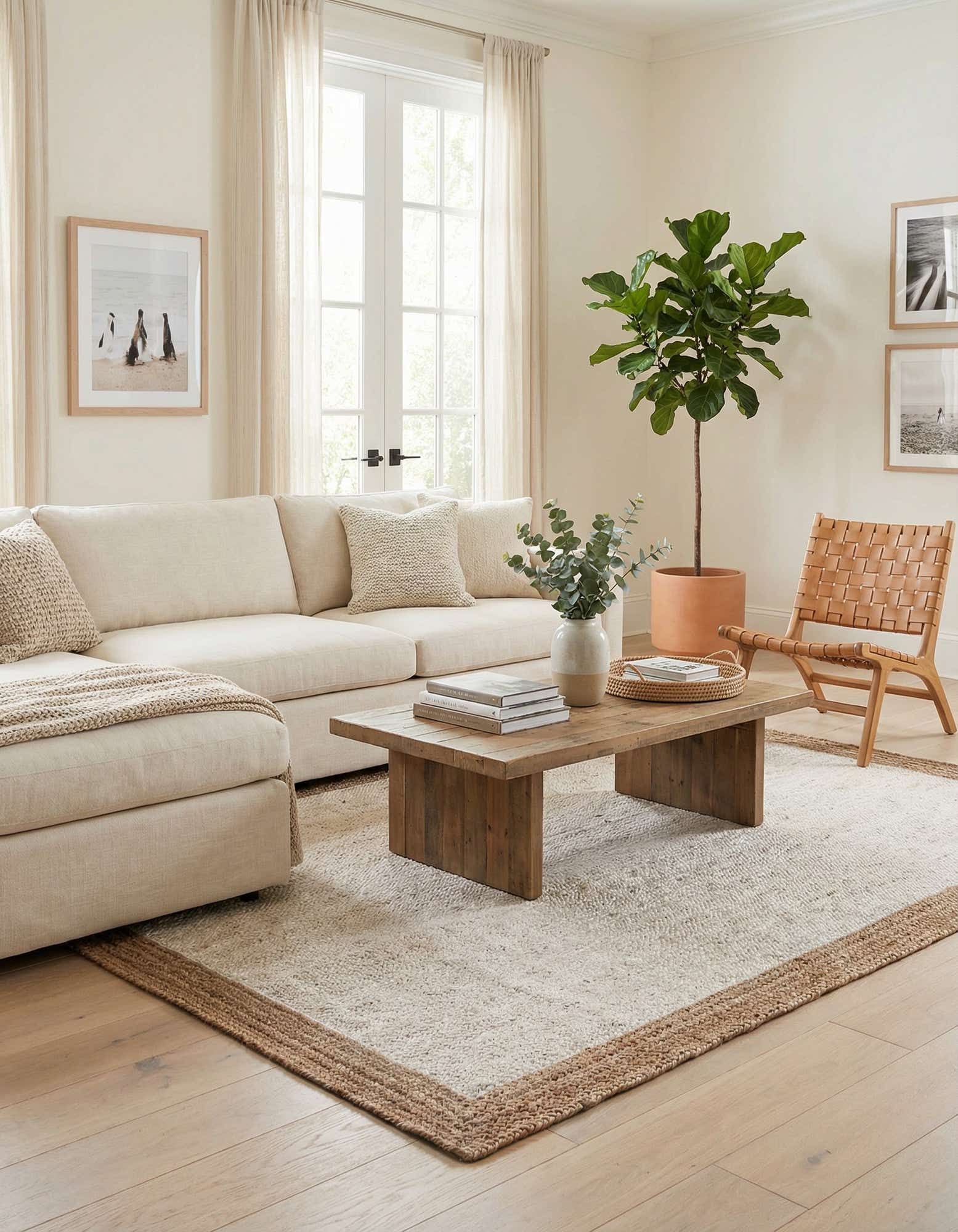 A clean, bordered design in soft white and natural beige brings a calm, grounded look to the room. The center field is a lightly ribbed white jute with subtle flecks of natural fiber, while a hand-braided beige border frames the piece and adds a gentle dimensional contrast. Hand braided of 100% jute, the weave has a tactile, low-profile surface—firm underfoot with a natural texture that adds visual warmth without bulk.