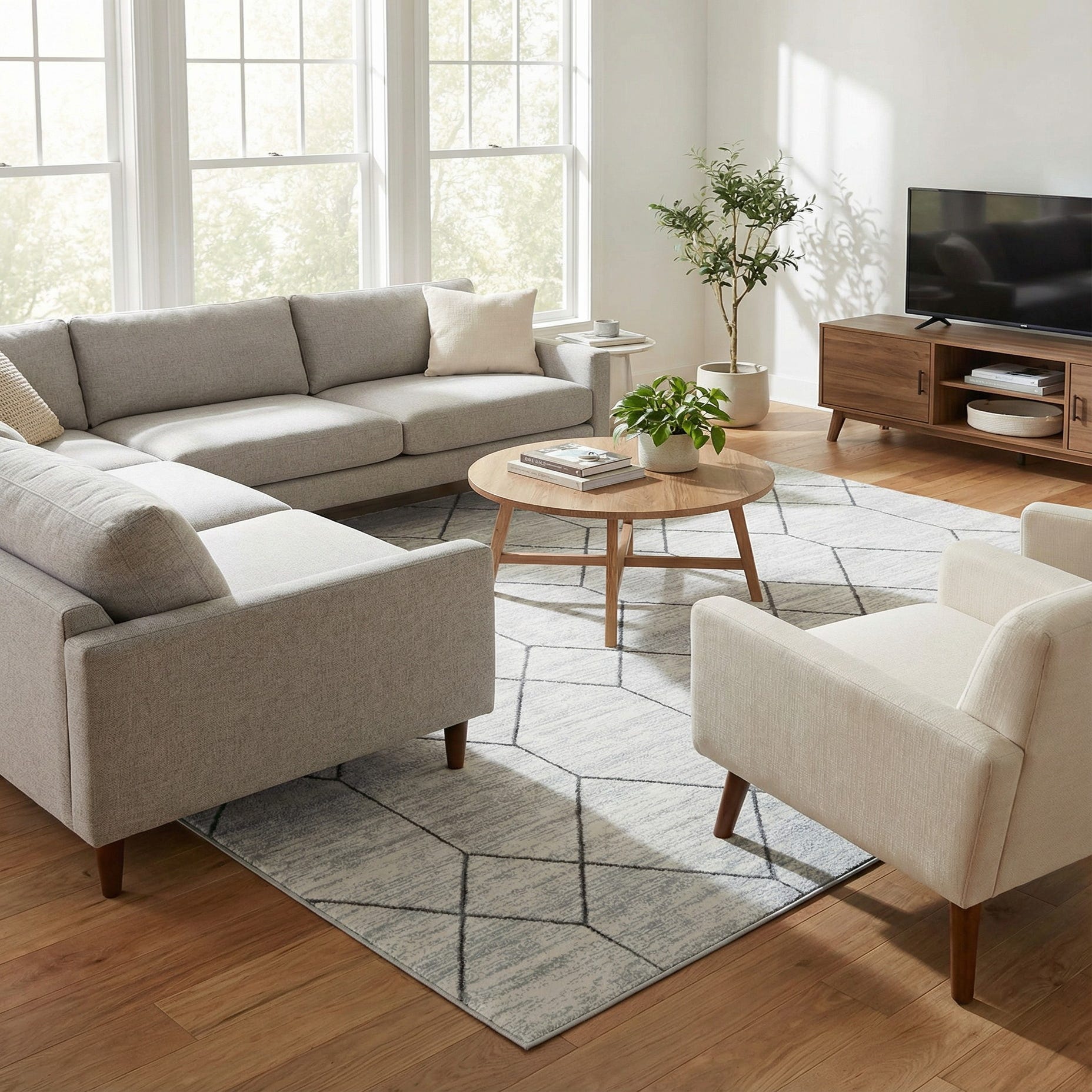 This restrained geometric works well in contemporary and transitional interiors—try it under a coffee table to anchor a living room with neutral upholstery, beneath a bed to introduce pattern without overwhelming a bedroom, or in a home office to bring quiet structure to the floor. It pairs nicely with pale woods and matte black metal accents, and provides a calming counterpoint to layered textiles and minimalist furnishings.