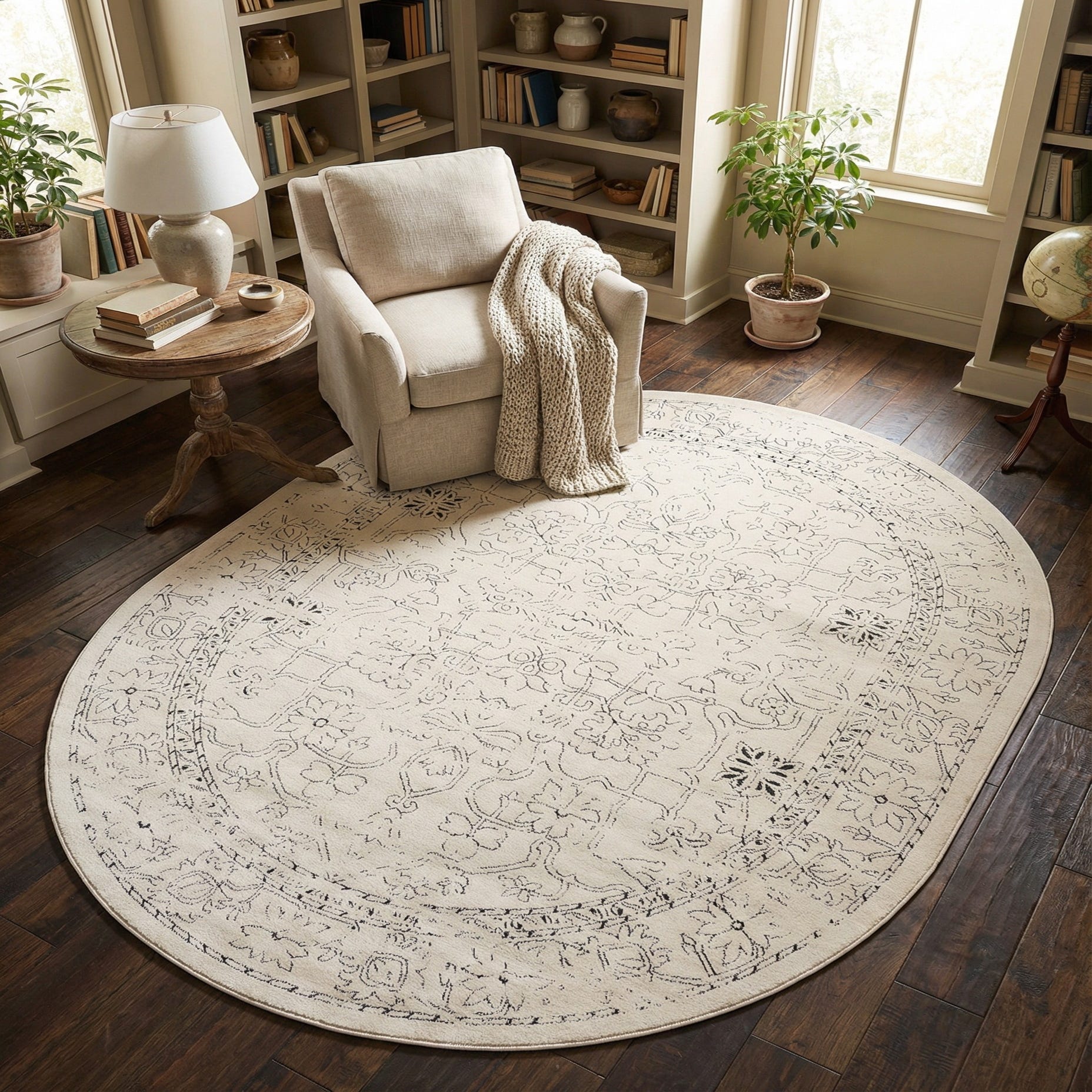 An oval rug with a clean white ground and an understated black pattern that reads like a softened, distressed medallion and floral field. Fine black lines trace arabesque flourishes, small floral motifs and a narrow border, creating a classic ornamental layout with a relaxed, slightly worn character. The contrast is crisp but gentle, so the design reads elegant without dominating a room.