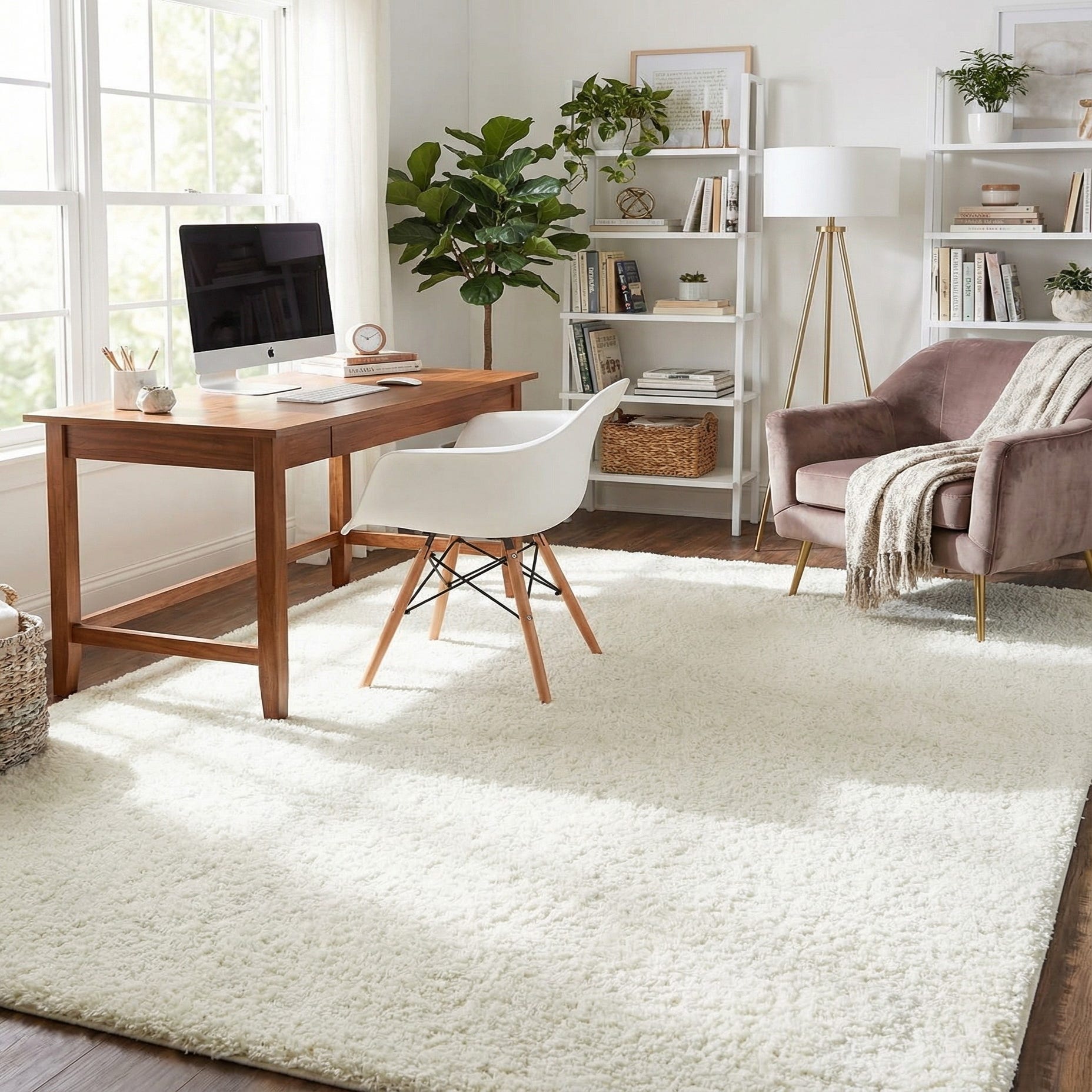 Machine made from 100% polypropylene, this rug balances softness with durable construction for everyday living. It pairs well with Scandinavian or contemporary interiors for a calm, airy feel, anchors a neutral living room beneath a low-profile sofa and coffee table, or adds a cozy layer to a bedroom over hardwood floors. The tactile shag pile also works nicely in a relaxed family room or a serene reading nook where comfort is a priority.