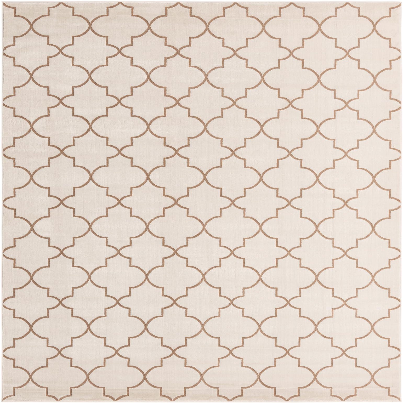 An 8x10 rectangular white area rug featuring a repeating modern quatrefoil pattern in light brown.
