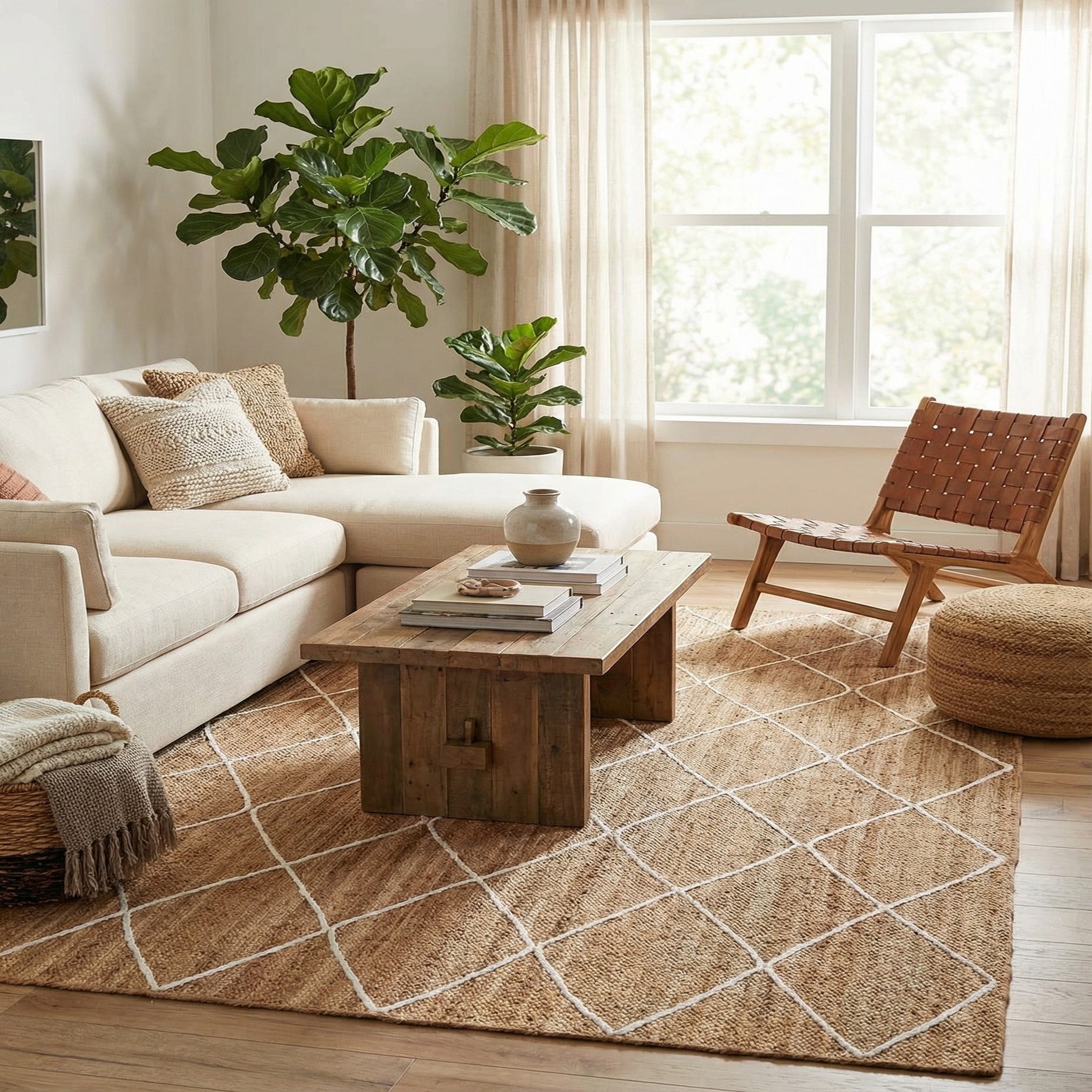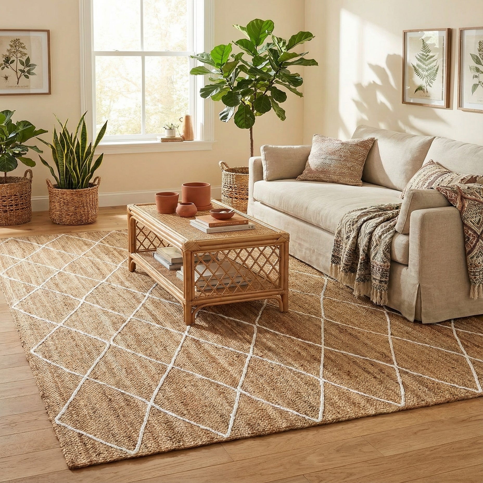 A rectangular 8x11 natural jute rug with a white diamond pattern, perfect for a modern living room.