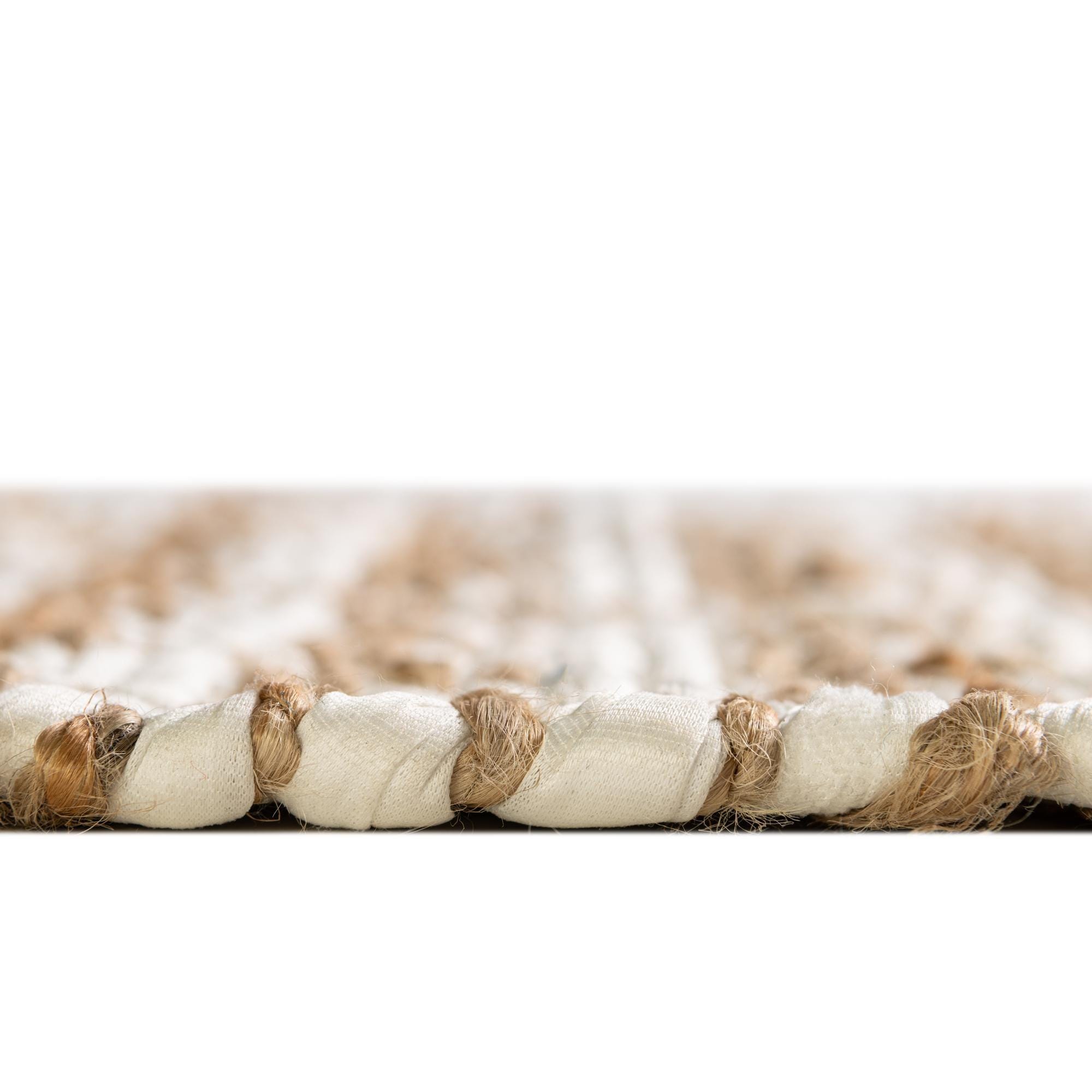 A subtle, small-scale check pattern in natural jute threads sits against a clean white ground, creating a calm, woven surface with gentle horizontal banding. The hand woven construction combines 60% cotton and 40% jute, giving the rug a low-profile, tactile feel — the cotton threads add softness underfoot while the jute provides a slightly nubby, organic texture and visible slubs that add depth and character. The neutral palette of white and natural tan keeps the look light and versatile.