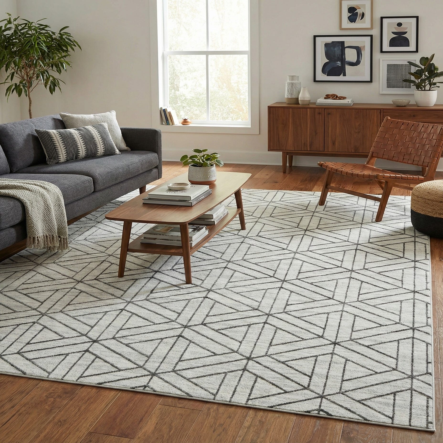 This neutral white-and-gray palette pairs naturally with light woods, black metal accents, and soft linen upholstery, making it well suited to modern, Scandinavian, or transitional interiors. Use it to anchor a living room seating group, define a dining area beneath a table, or add quiet graphic interest at the foot of a bed — in each setting the rug brings subtle pattern and a comfortable, tactile surface.