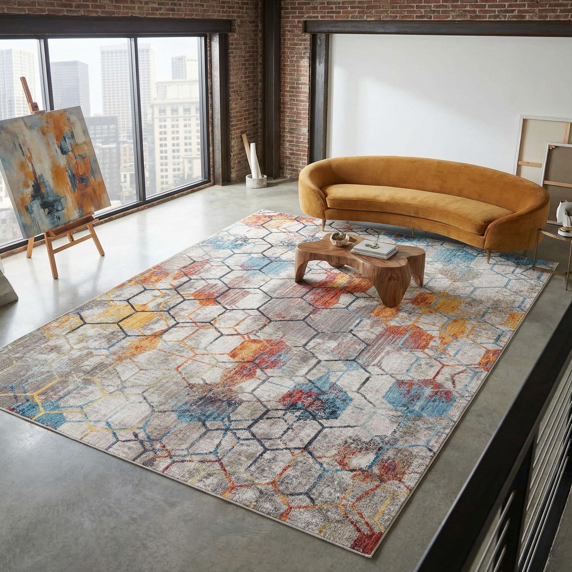 A honeycomb lattice traces a geometric framework across a white ground, its thin navy and black outlines creating a structured backdrop for painterly color washes. Fields of blue, navy, gold and orange are applied in a distressed, brushstroke-like manner, so the pattern reads as both modern geometry and abstract art. The space-dyed yarn produces subtle color variation and soft transitions between hues, giving the surface visual depth and movement.