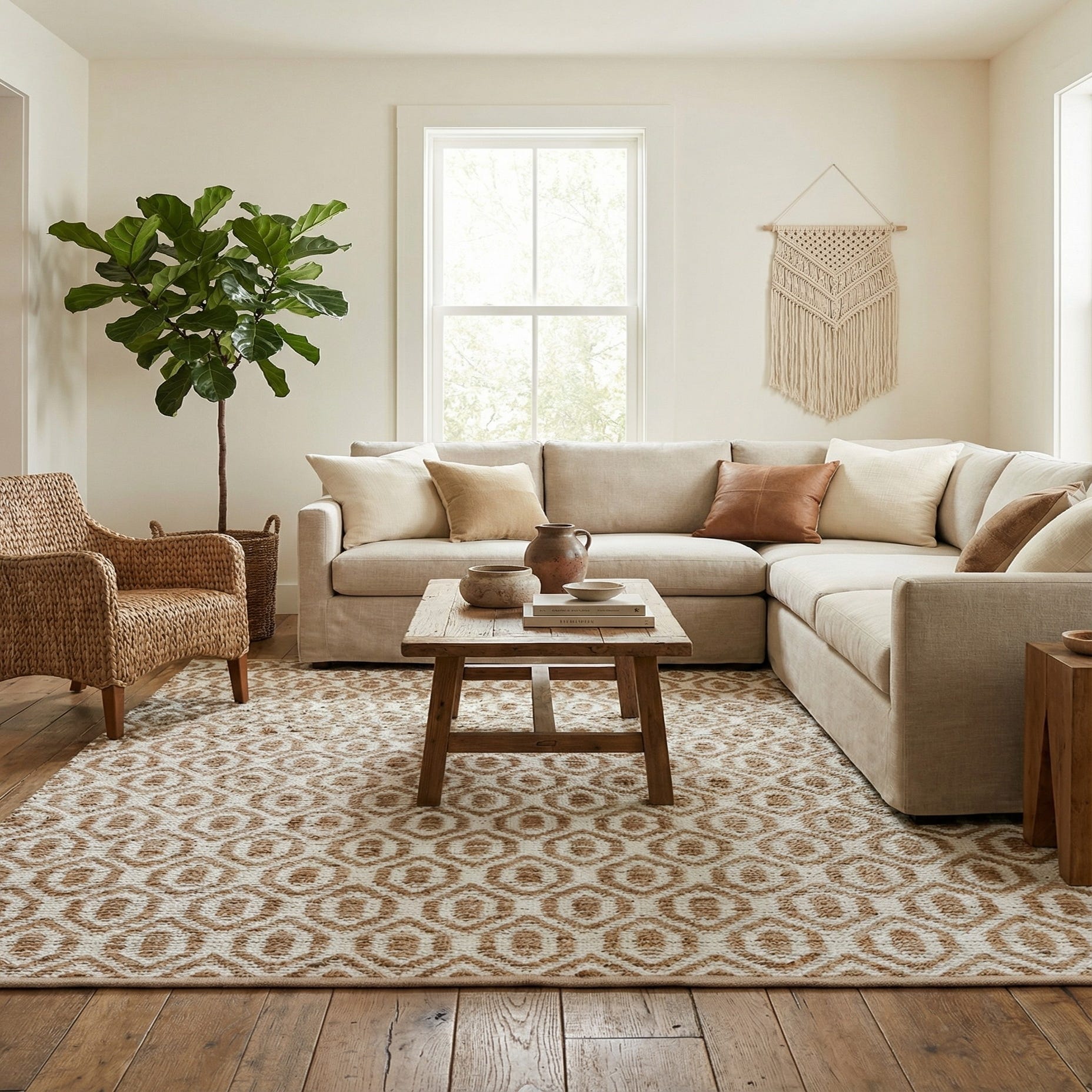 Hand woven from 60% cotton and 40% jute, the rug has a low-profile, textured surface where the softness of cotton meets the natural fiber character of jute. Running your hand over it reveals a gently nubby weave with visible striations from the handcrafting process, creating both visual depth and a tactile warmth. This piece works well under a living room coffee table, beneath a dining table, or layered in a bedroom; it pairs particularly nicely with natural woods, rattan or wicker accents, linen upholstery, and neutral, coastal, Scandinavian, or modern farmhouse schemes.