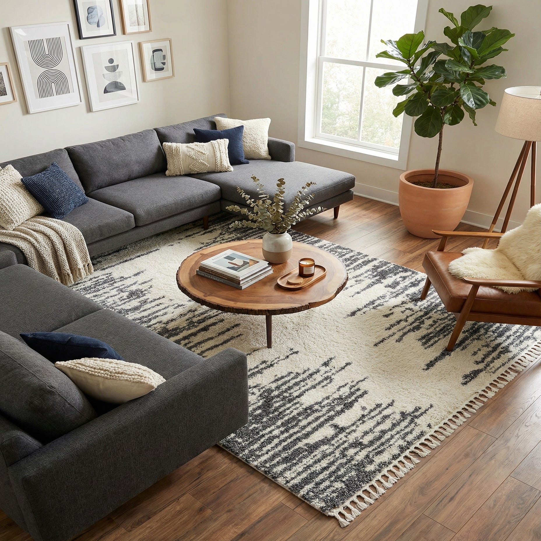 This rug works well in contemporary, minimalist, or Scandinavian interiors where a neutral palette and subtle texture are desired. Place it under a coffee table to define a living area, layer it over wood or tile for added warmth, or position it alongside a bed to introduce softness underfoot. It also pairs nicely with warm wood tones, matte metal accents, and simple, streamlined furniture for a calm, collected look.