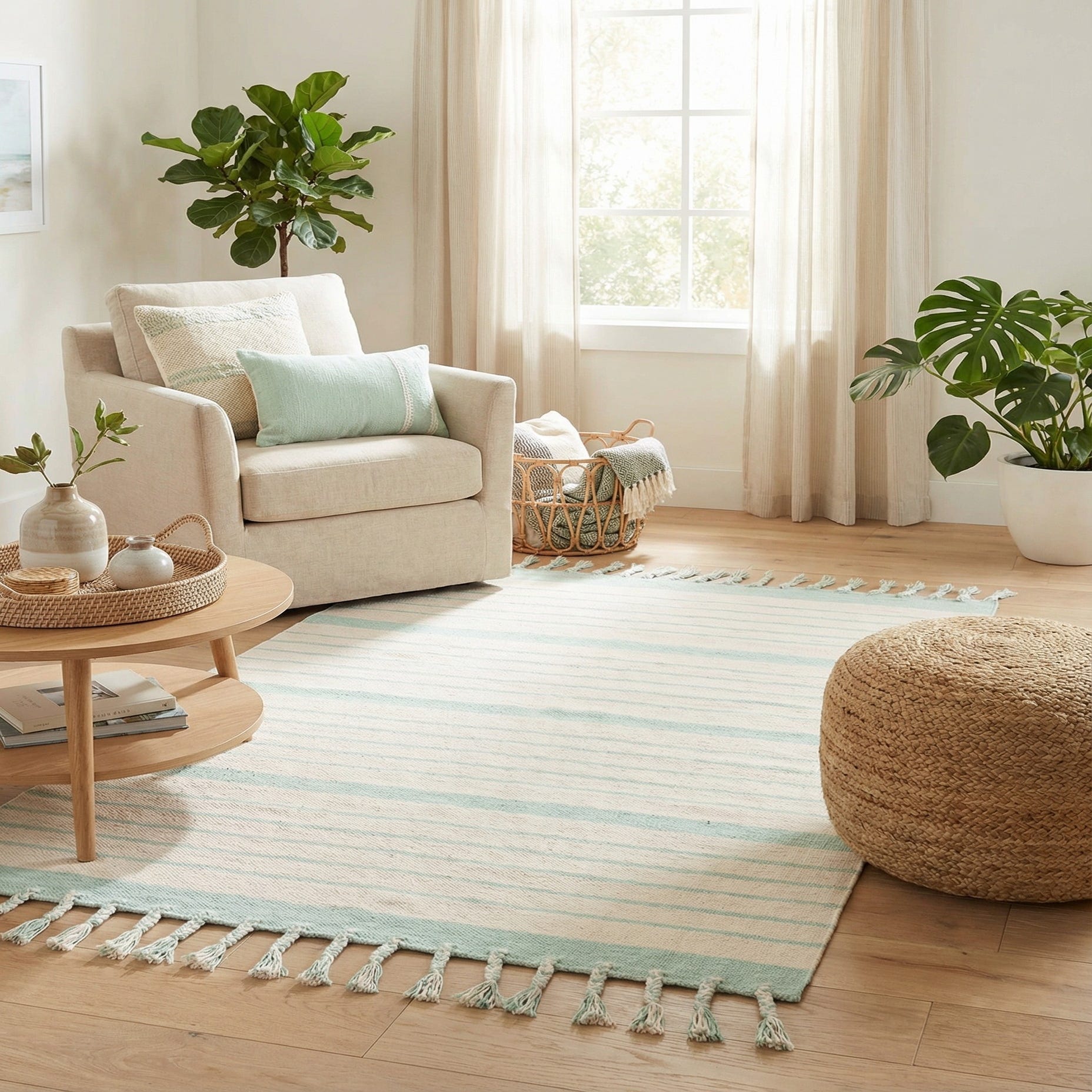 Hand-woven from 100% cotton, this flatweave rug pairs a clean white ground with narrow aqua stripes and broader aqua bands for a calm, linear pattern. The surface is low-profile and slightly textured underfoot, with tightly woven cotton yarns that feel soft to touch. Braided tassels at each end add a relaxed, handmade detail that complements the rug’s simple, stripe-driven design.