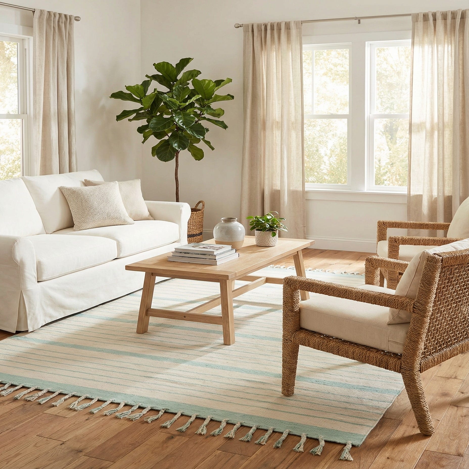 A rectangular 8x10 white and aqua striped flatweave cotton rug with tassels, suitable for a living room.