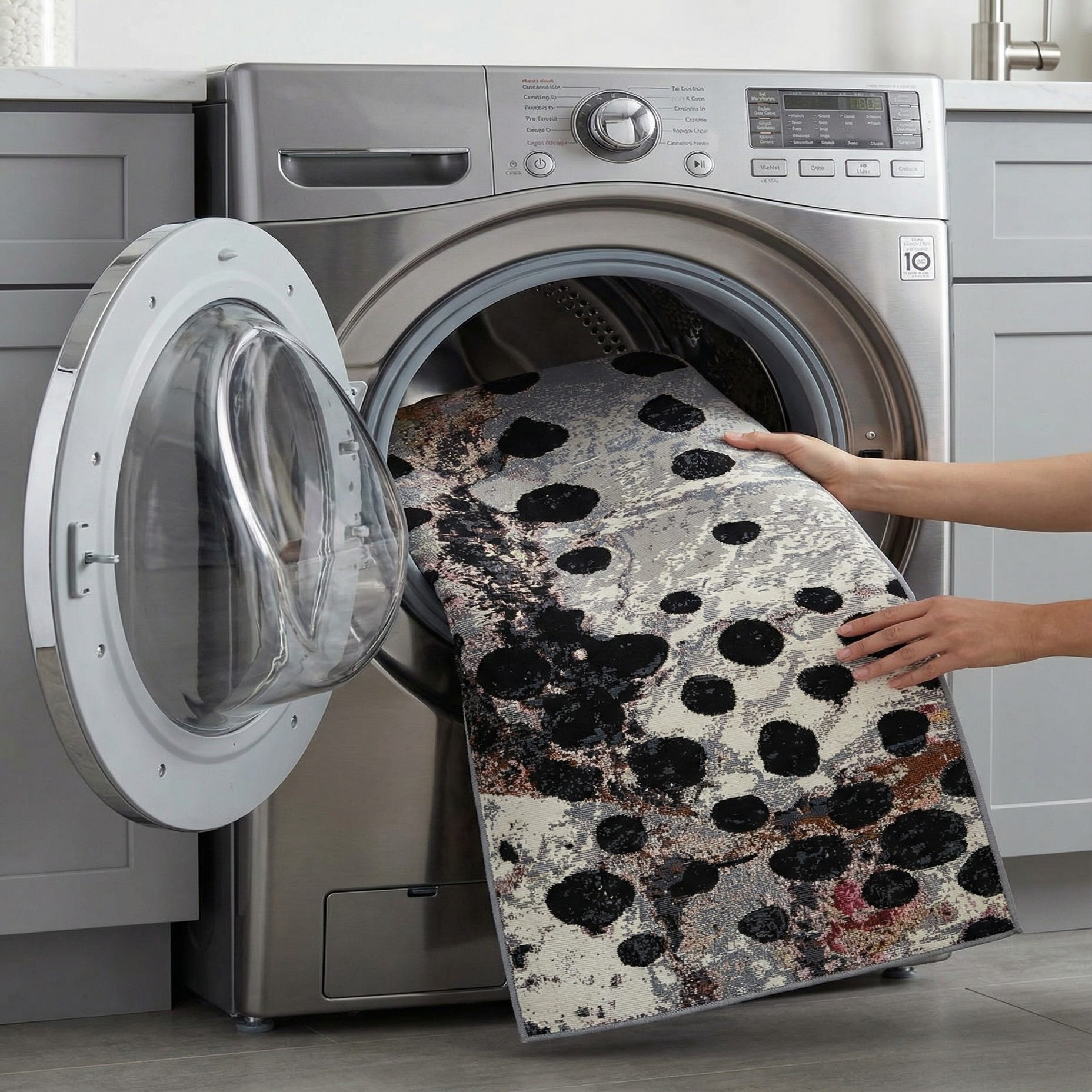 A contemporary runner with a bold, graphic personality, this machine-made rug is constructed from 100% polypropylene for a low-profile, tightly woven surface. Its white-and-black background anchors an abstract composition of irregular black spots layered over painterly washes of gray, olive, orange, yellow, pink and red. The contrast between the dark, tactile dot motifs and the softer, multicolored underlayers creates a sense of depth and movement while the polypropylene construction gives the rug a smooth, slightly textured feel underfoot.