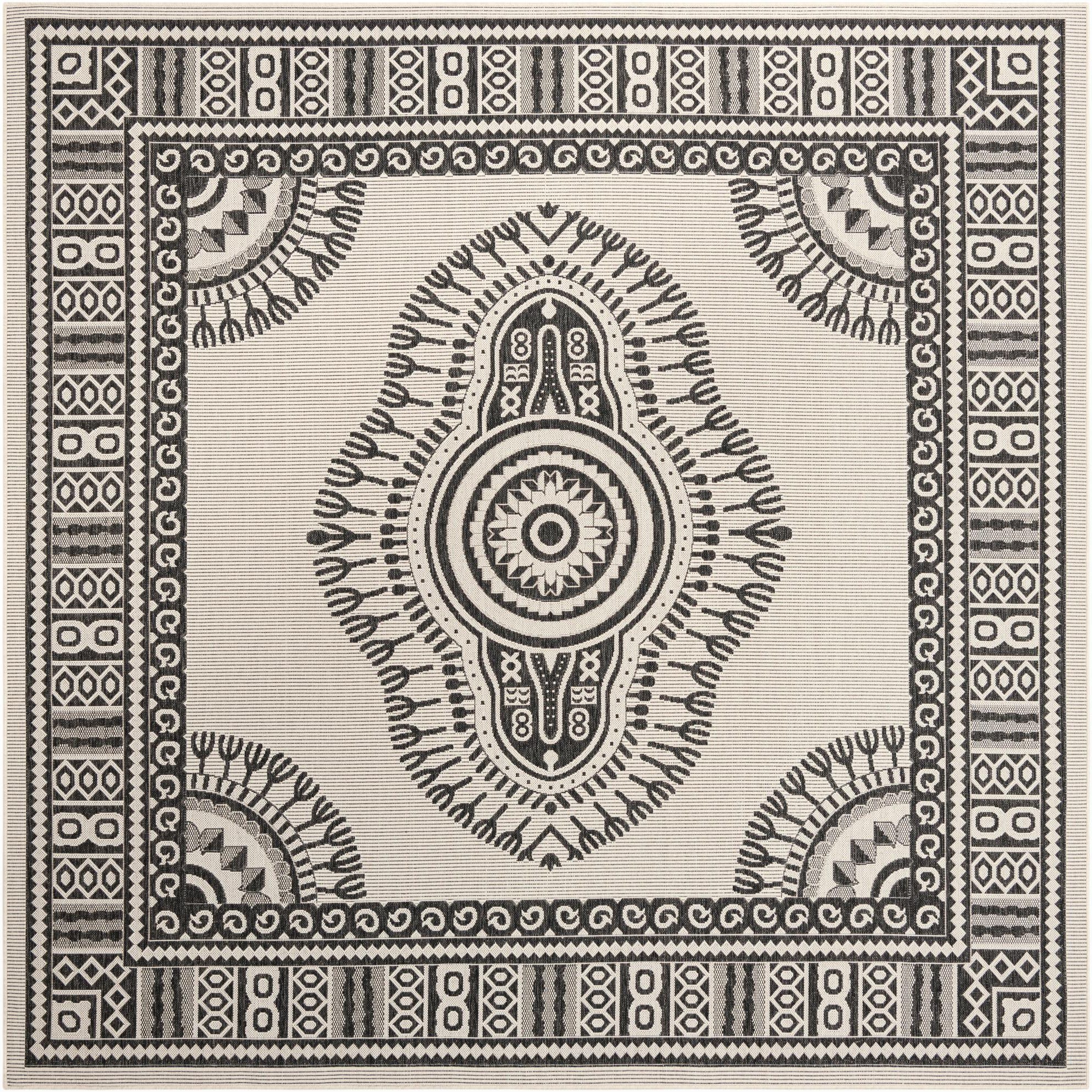 A 10' square black and ivory outdoor rug with a central medallion and ornate border patterns.