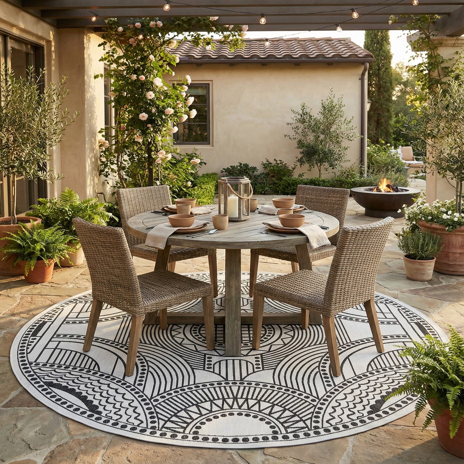 With its timeless colors and aesthetic, this round rug fits seamlessly into a range of decor scenarios, including traditional outdoor patios, contemporary living spaces, or as a striking accent piece within minimalist designs. It complements furnishings in neutral tones and can serve as a focal point or an anchoring element to unify various decor elements in a given space.