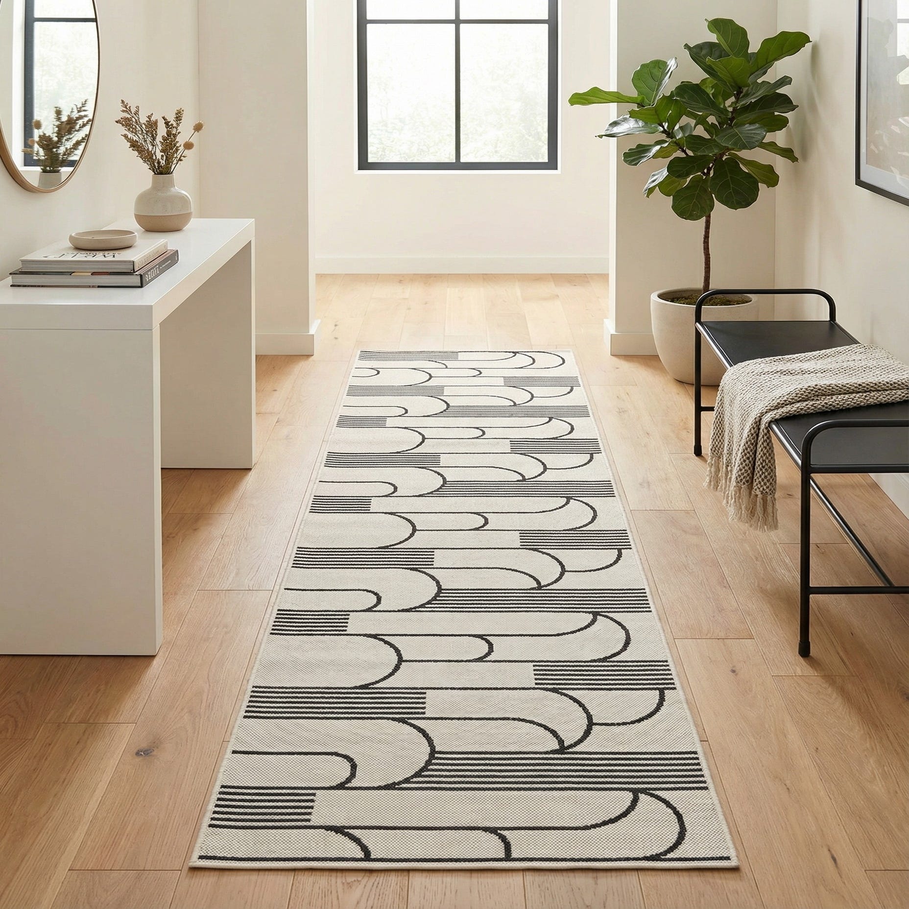 A graphic, modern pattern of rounded bars and narrow stripe blocks plays across a clean white ground in crisp black lines. The repeating geometric motif creates a sense of forward movement along the runner, while the contrast between solid arcs and tightly spaced stripes keeps the look fresh and architectural. The palette is strictly white and black, making the design an easy anchor for monochrome or high-contrast interiors.