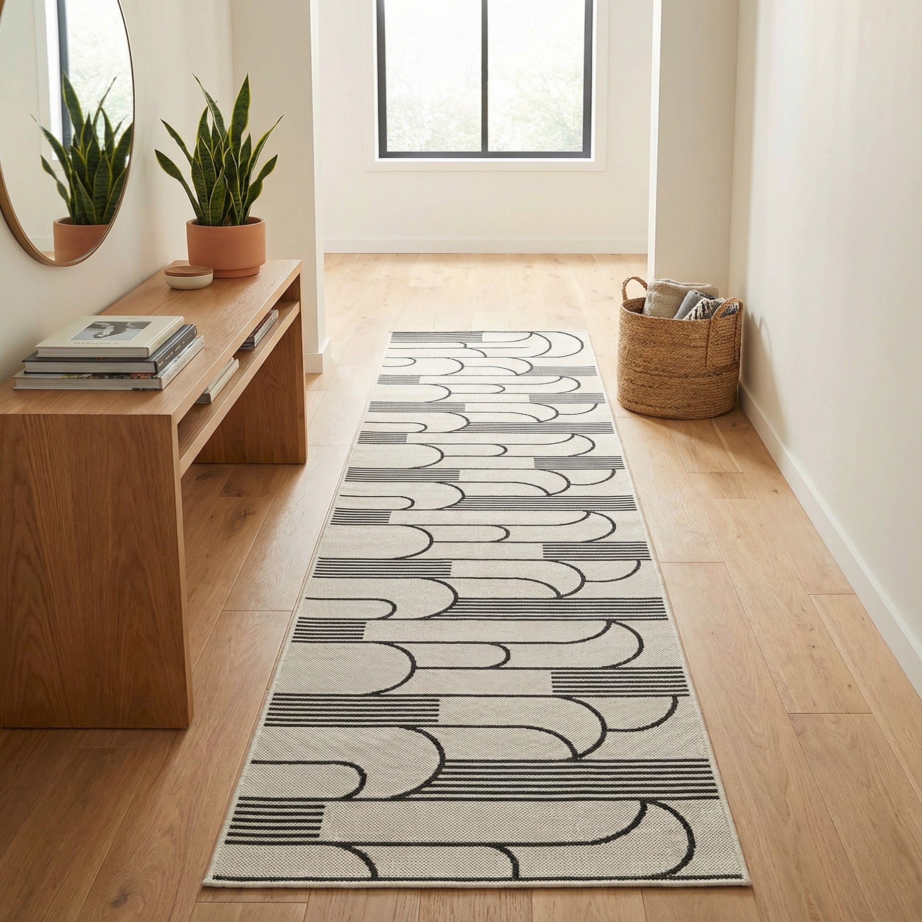 A 12 ft runner rug with a modern black and ivory geometric pattern, featuring interlocking curves and horizontal stripes.