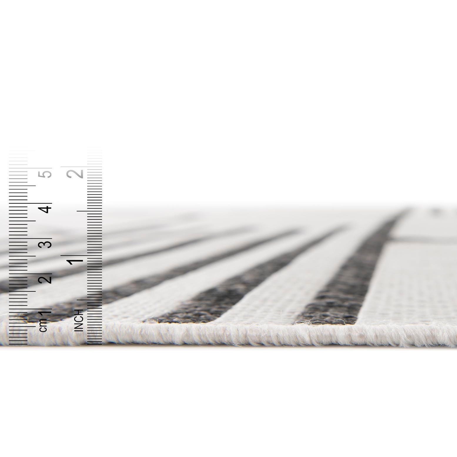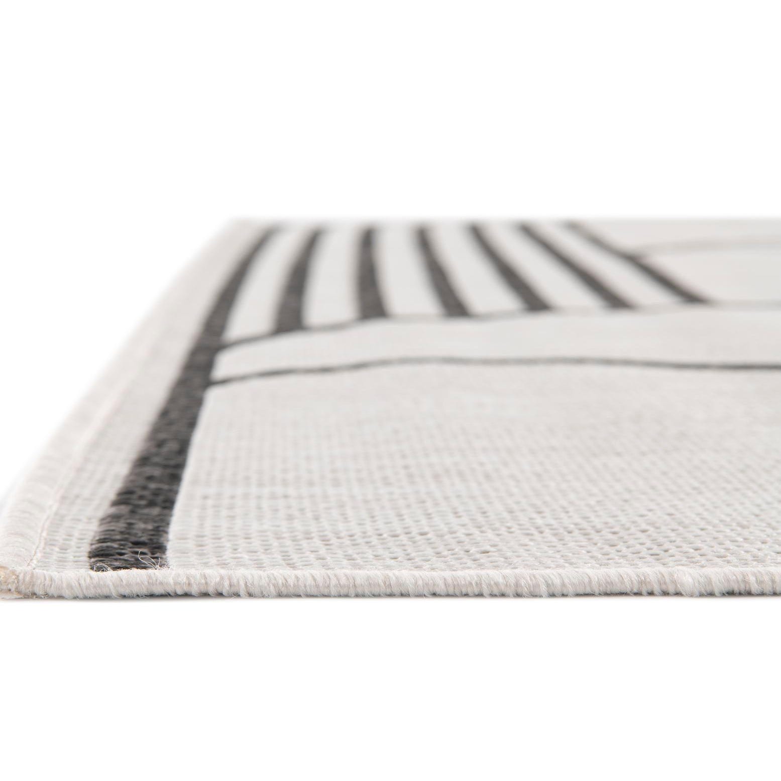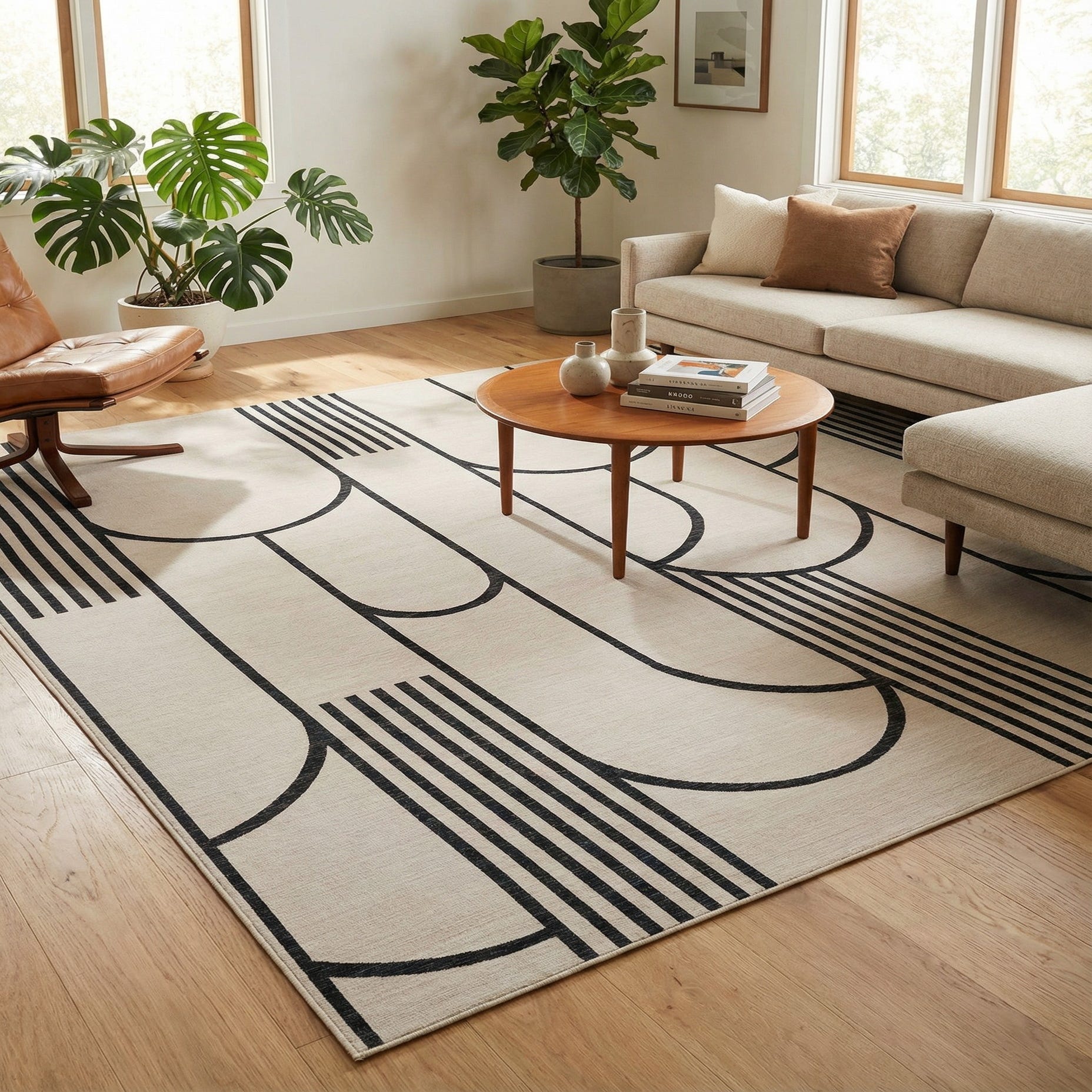 This modern-themed rug is highly versatile and can effortlessly complement a variety of decor styles, from contemporary to minimalist settings. It would be well-suited for patios, dining areas, or living rooms where a statement piece is desired. Its geometric pattern can also help to anchor furniture in a larger open-plan area, providing a sense of structure and coherence to the layout.