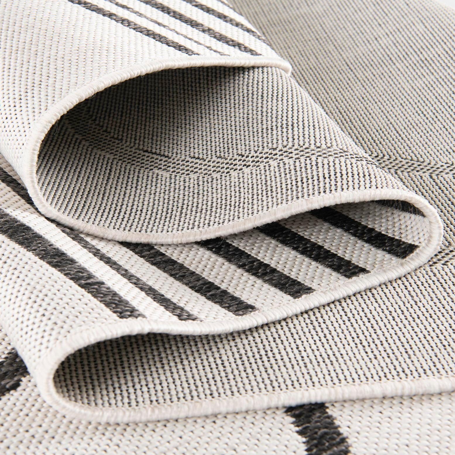 The texture of the rug is indicative of a flatweave construction, which provides a smooth surface underfoot and contributes to the piece's suitability for high traffic areas. Additionally, the rug's material is stain-resistant and pet-friendly, allowing for both outdoor and indoor use without significant wear. The shed-free nature of the rug promotes a clean environment, suitable for spaces frequented by children and pets.