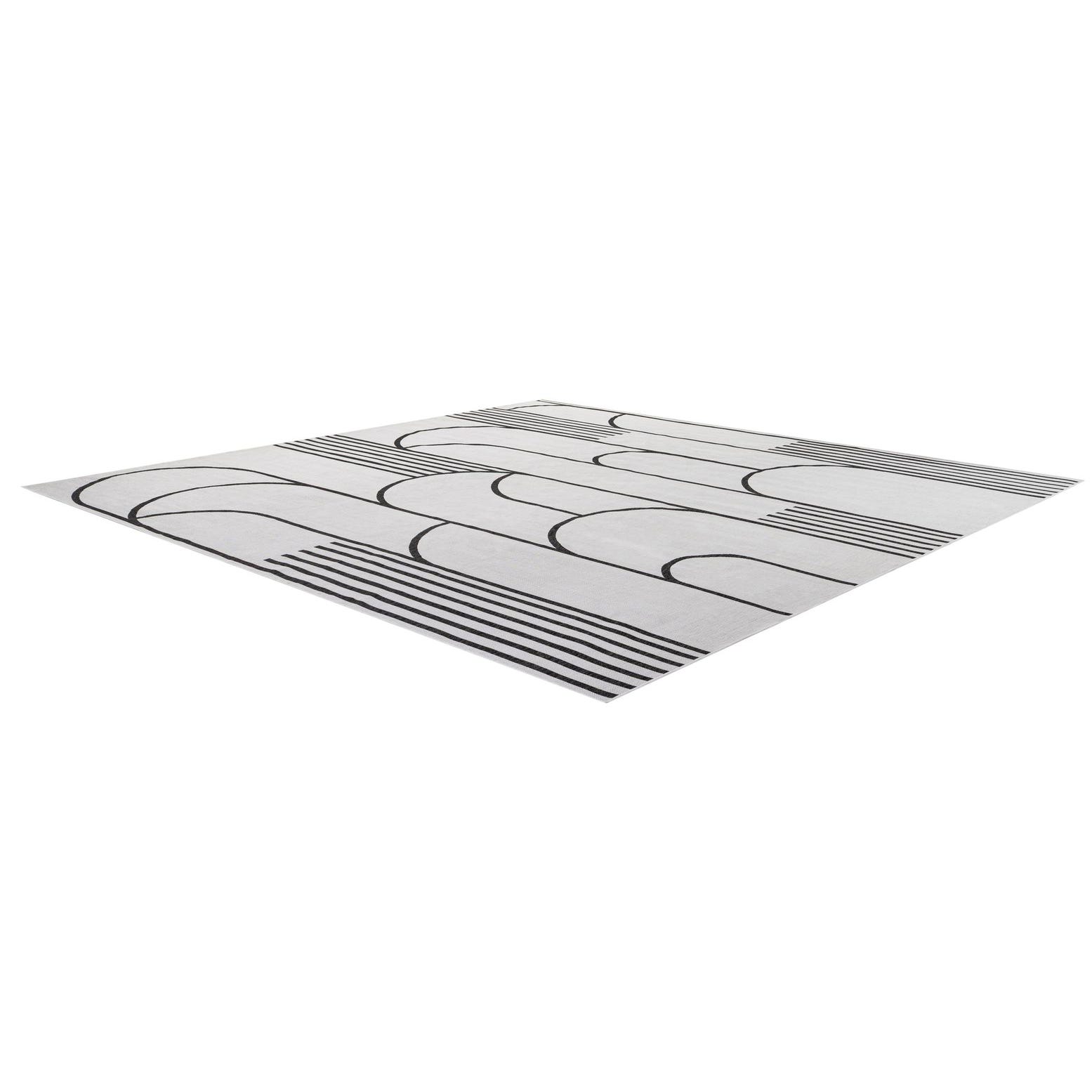 A 13' square modern outdoor rug in black and ivory, featuring a bold geometric pattern of curved and striped lines.