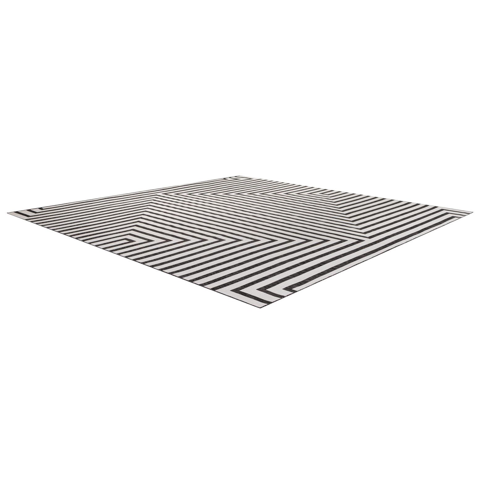A 13' square black and ivory modern striped rug with an optical geometric pattern, suitable for indoor or outdoor use.