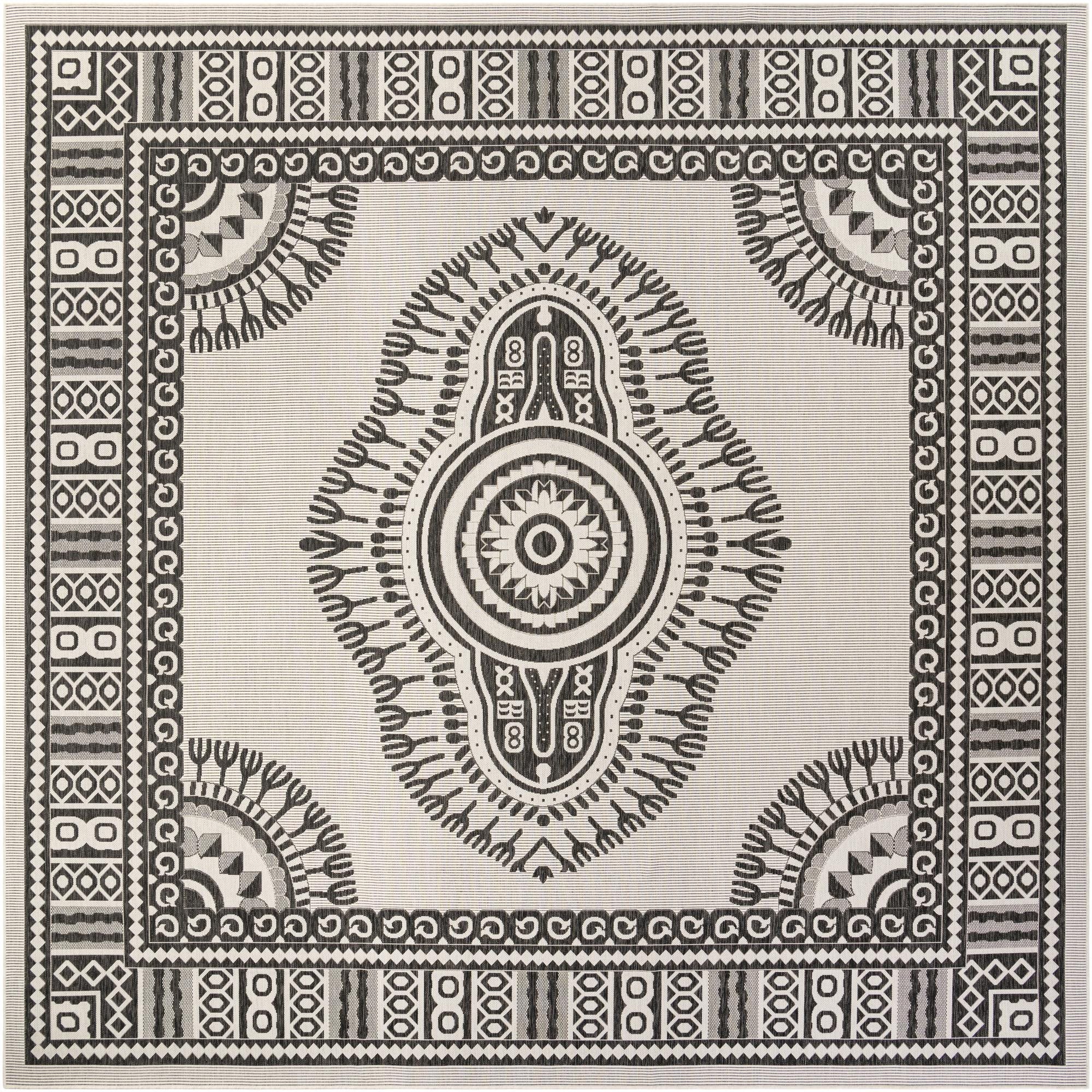 A 13' square modern black and ivory outdoor rug with a central medallion and ornate border.