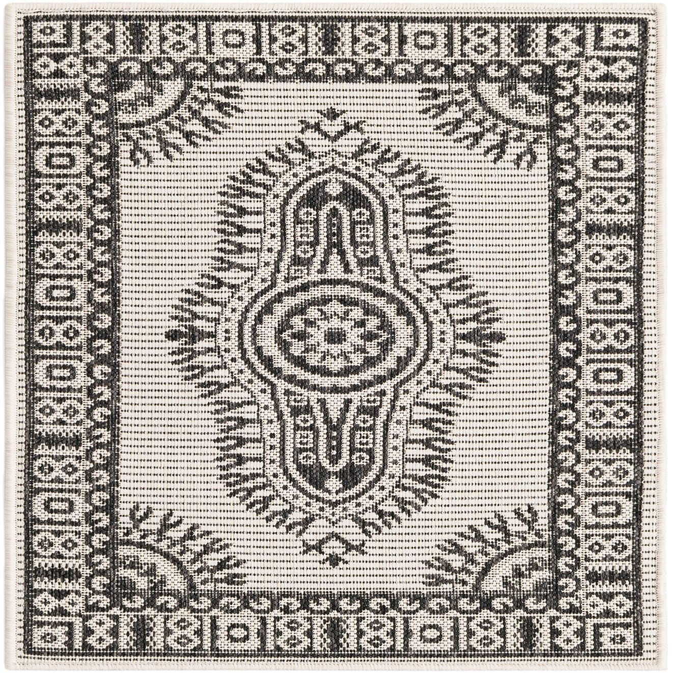 This 2x3 rug from the Outdoor Traditional collection is machine-woven using 100% polypropylene, ensuring both durability and easy maintenance. The design features a dynamic interplay of black and white, creating a striking contrast that draws the eye. The central motif is reminiscent of classic medallions, while the border showcases intricate geometric patterns, giving the rug a timeless elegance.