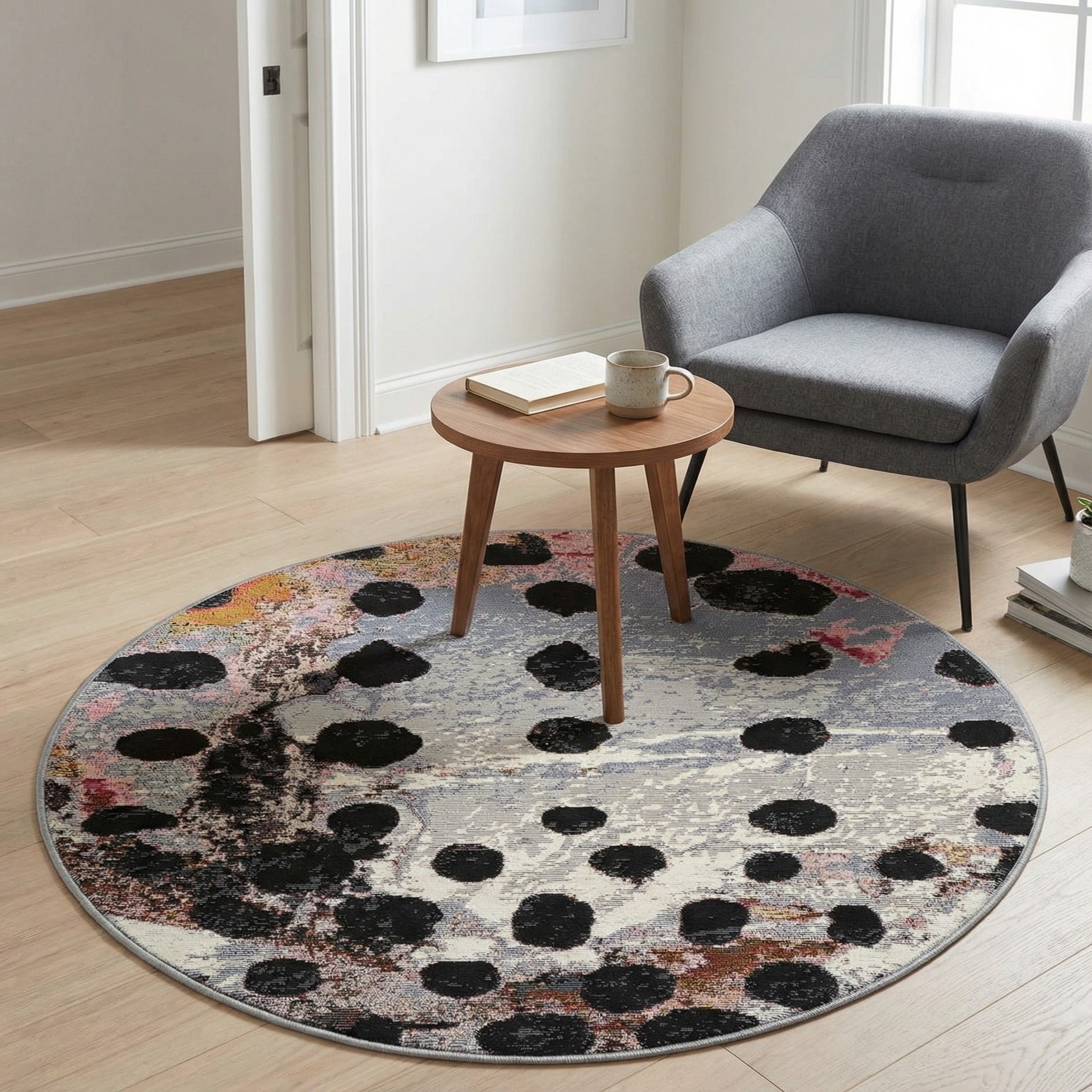 A round accent rug with an abstract, painterly pattern: irregular black dots are scattered across a white-and-black background, layered over soft gray striations and washes of pink, gold and red. The composition feels deliberately uneven and artful, with denser clusters of dots balancing open, textured areas. Machine made from 100% polypropylene, the rug has a low-profile, tightly woven surface that offers a subtle, tactile rib and a neatly finished edge.