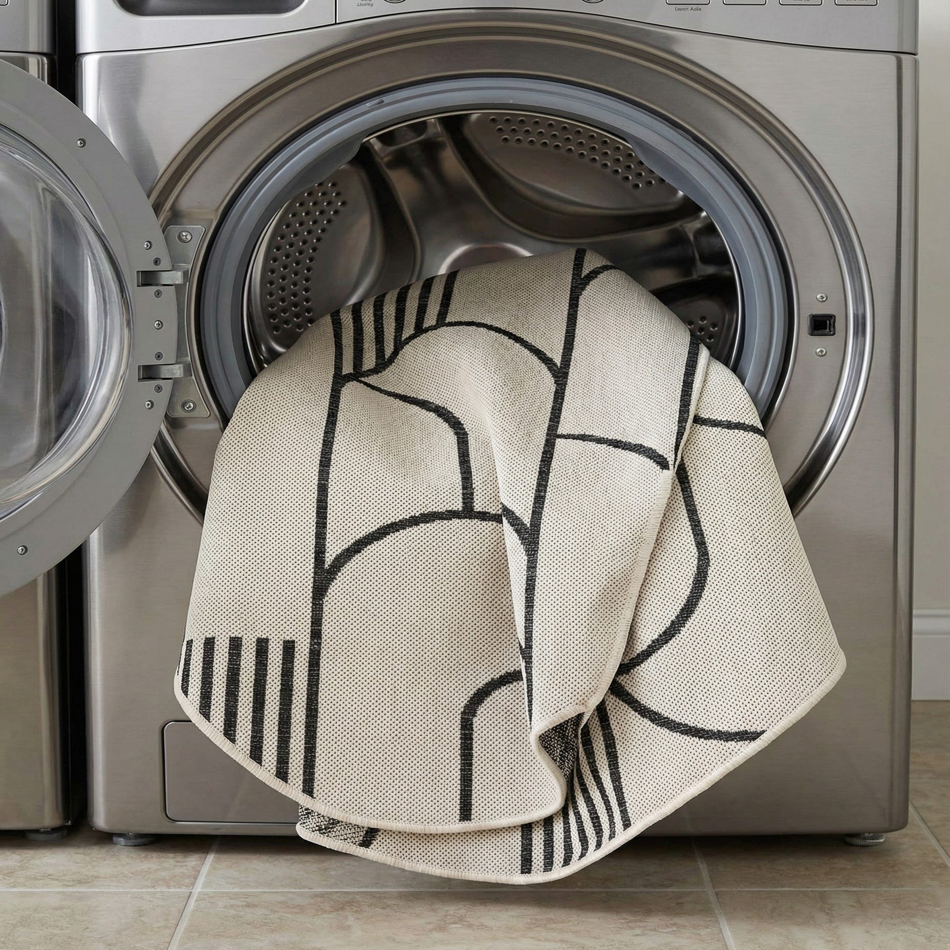 The black and white color scheme of this rug allows it to integrate seamlessly into a variety of design scenarios, from contemporary urban balconies to elegant monochromatic living spaces, and even eclectic interior designs that benefit from a bold graphic element. This rug is a practical addition to an outdoor patio, sunroom, or any indoor area seeking a touch of modern flair.