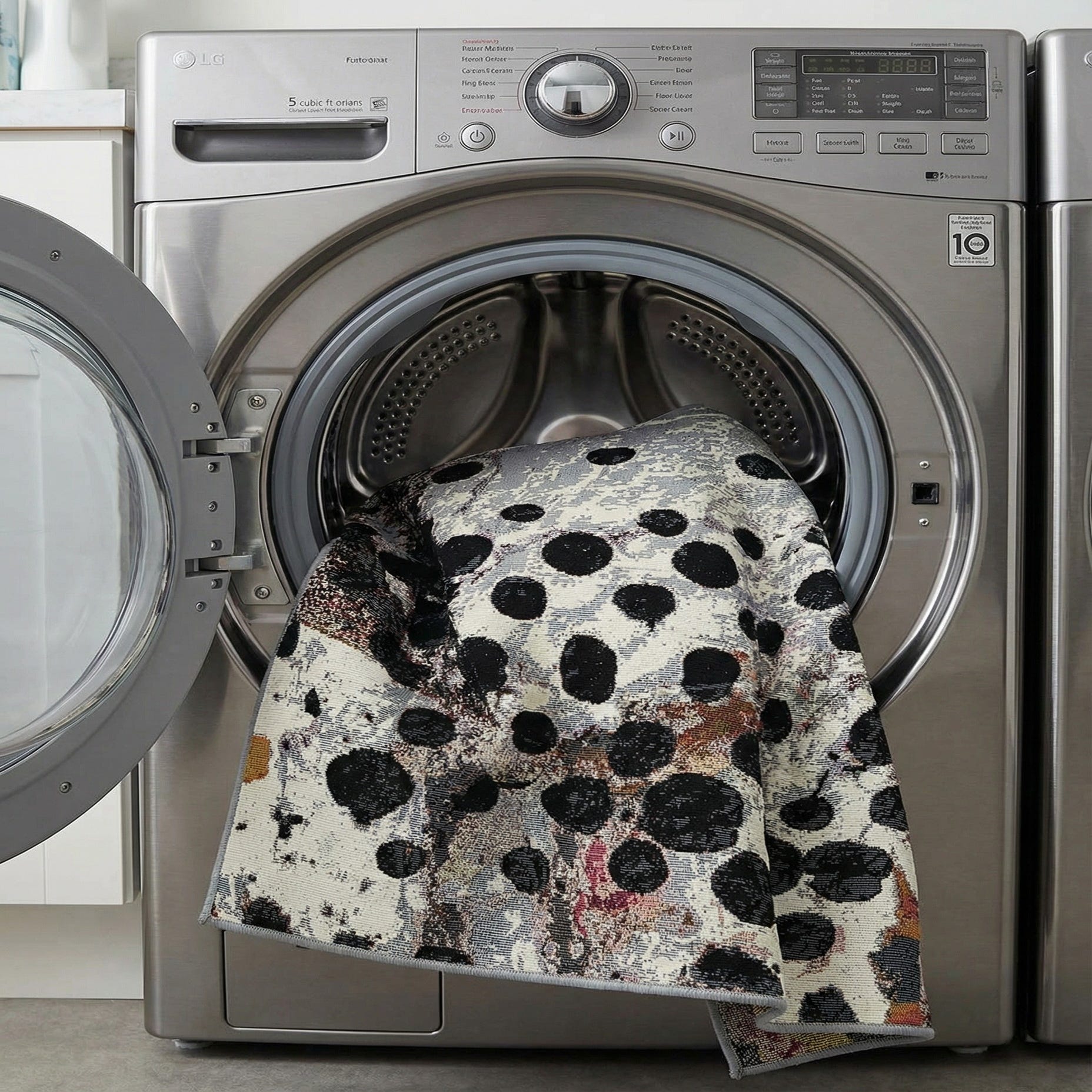 A 4x6 rectangular indoor/outdoor rug featuring an abstract pattern of black spots over a textured background of ivories, creams, and subtle pastels.