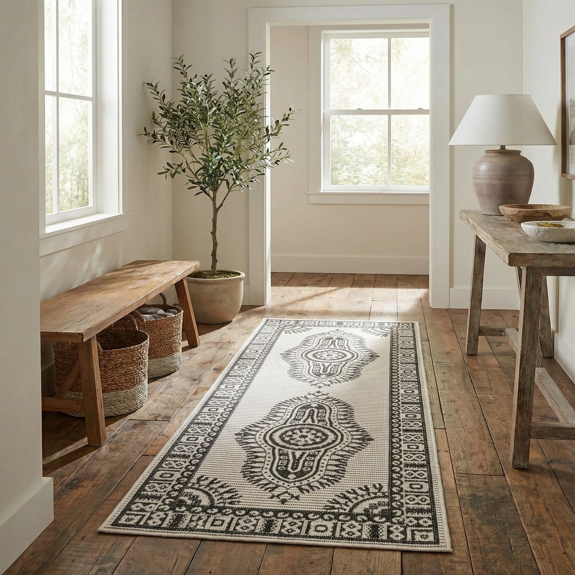 A 5 ft runner rug in black and ivory with a traditional medallion pattern, ideal for a hallway or patio.