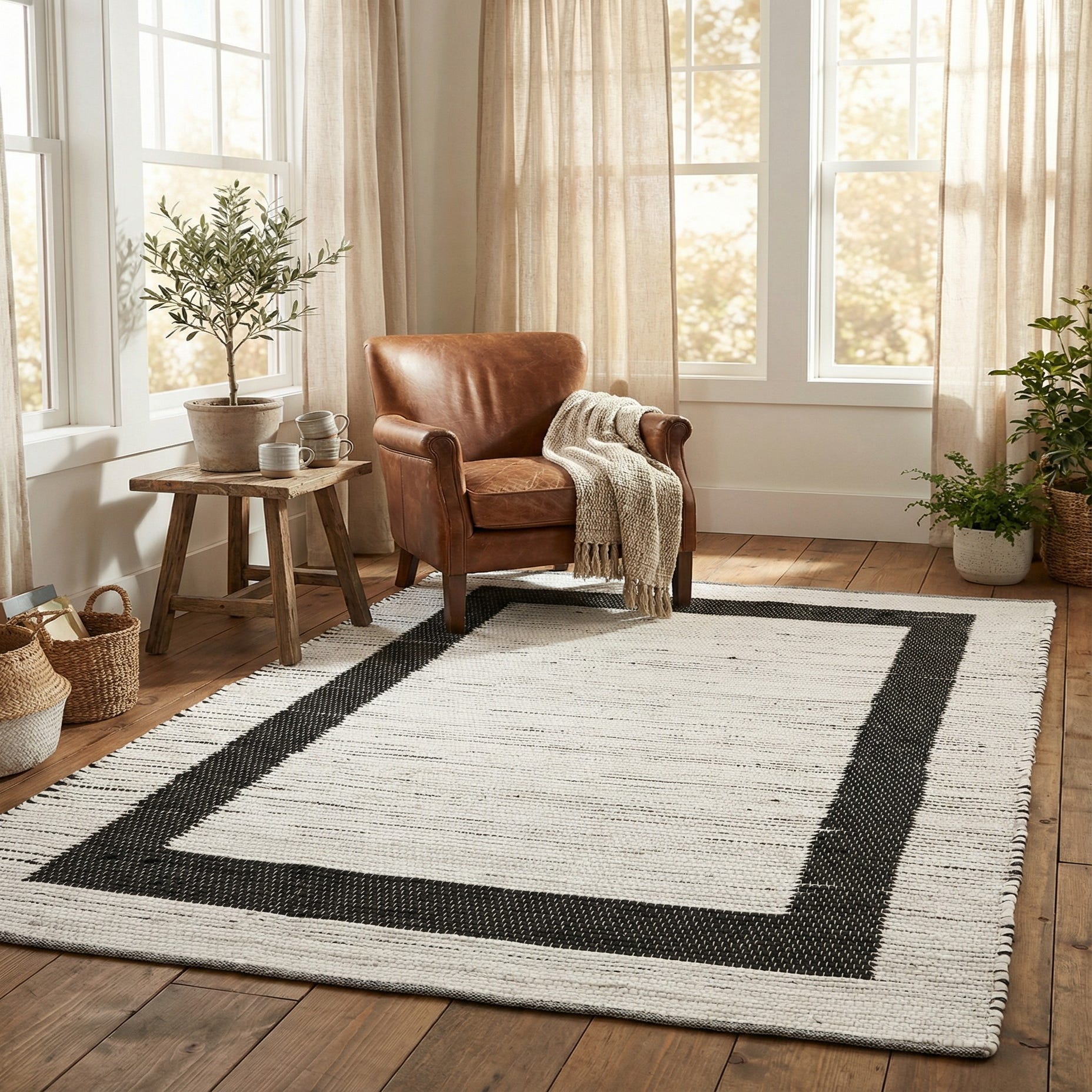Hand-woven from 60% cotton and 40% jute, this flatweave rug has a low-profile, tactile surface that balances soft cotton with the natural texture of jute. A bold black rectangular border is inset from the edges, creating a clear, graphic frame around a predominantly white field. Fine black slubs run irregularly through the white ground, giving the piece an artisanal, hand-spun character while keeping the overall look clean and modern.