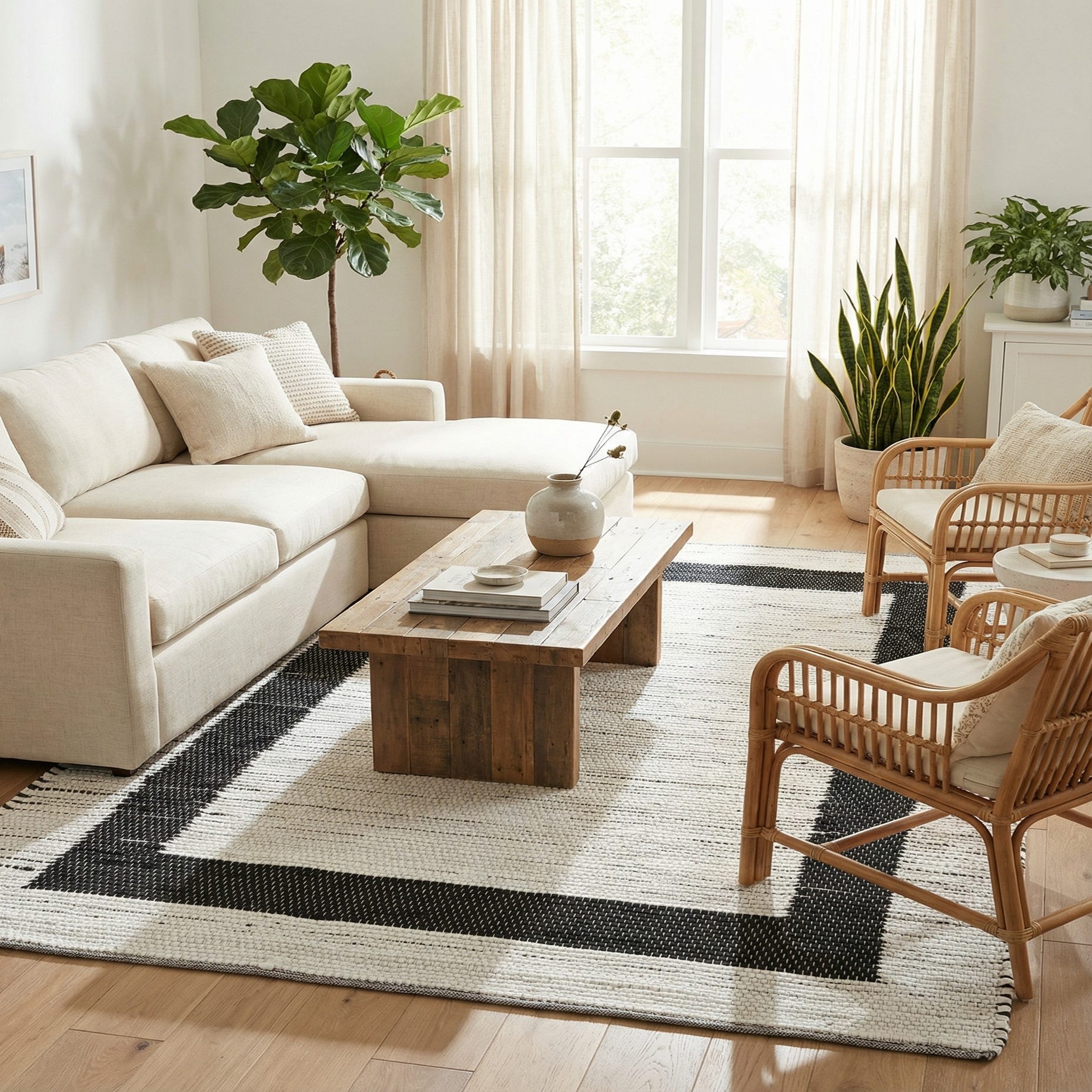 This rug works well in contemporary, Scandinavian, or transitional interiors where a crisp, monochrome anchor is desired. Use it to define a seating area beneath a sofa and coffee table, lay it alongside a bed to add visual contrast in a neutral bedroom, or place it in an entryway or small dining nook to bring structure to the floor plane. The flatweave profile sits comfortably under furniture legs and layers nicely over hardwood or tile for added warmth and pattern.