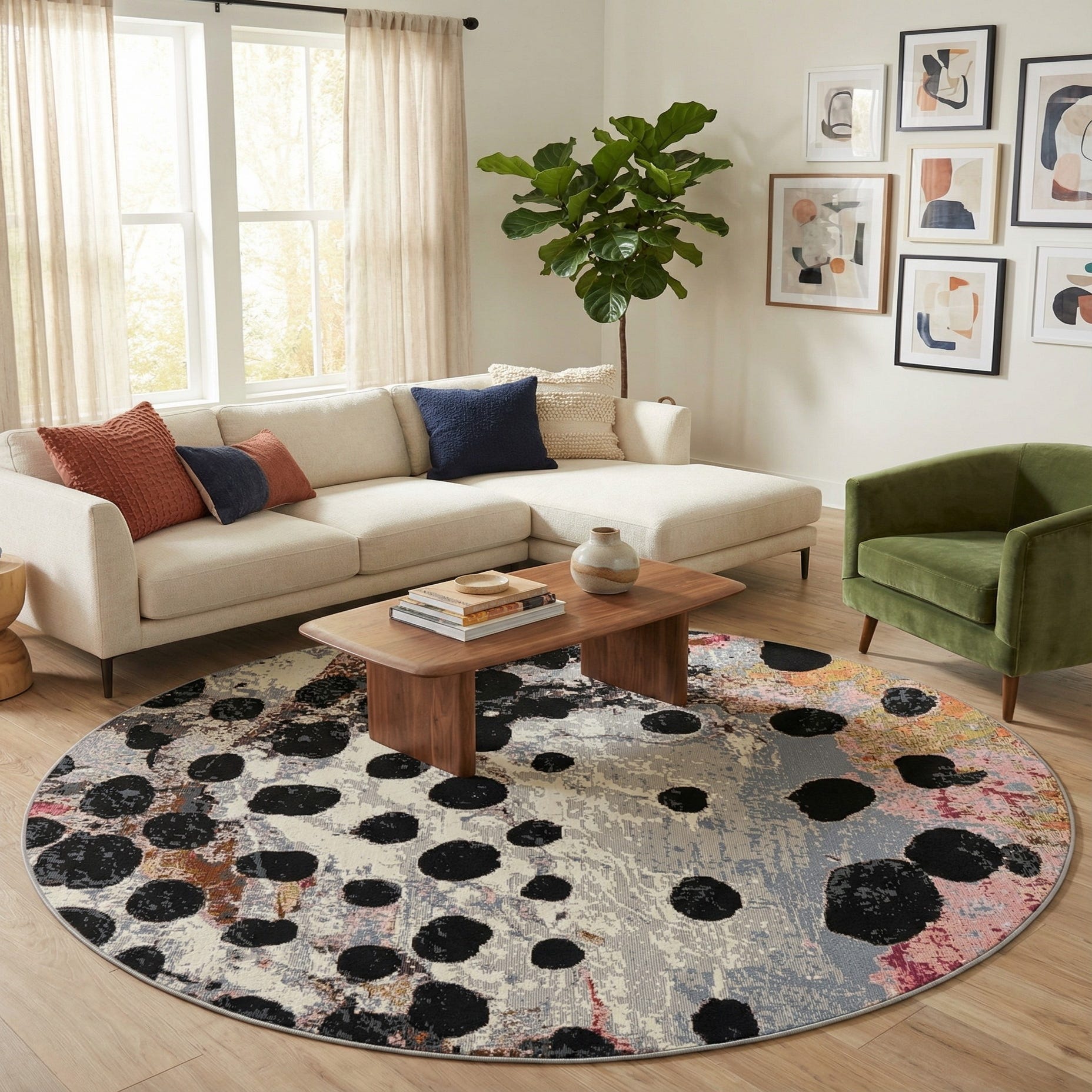 A 6' round black, ivory, and white abstract rug with large and small irregular black spots on a textured background.