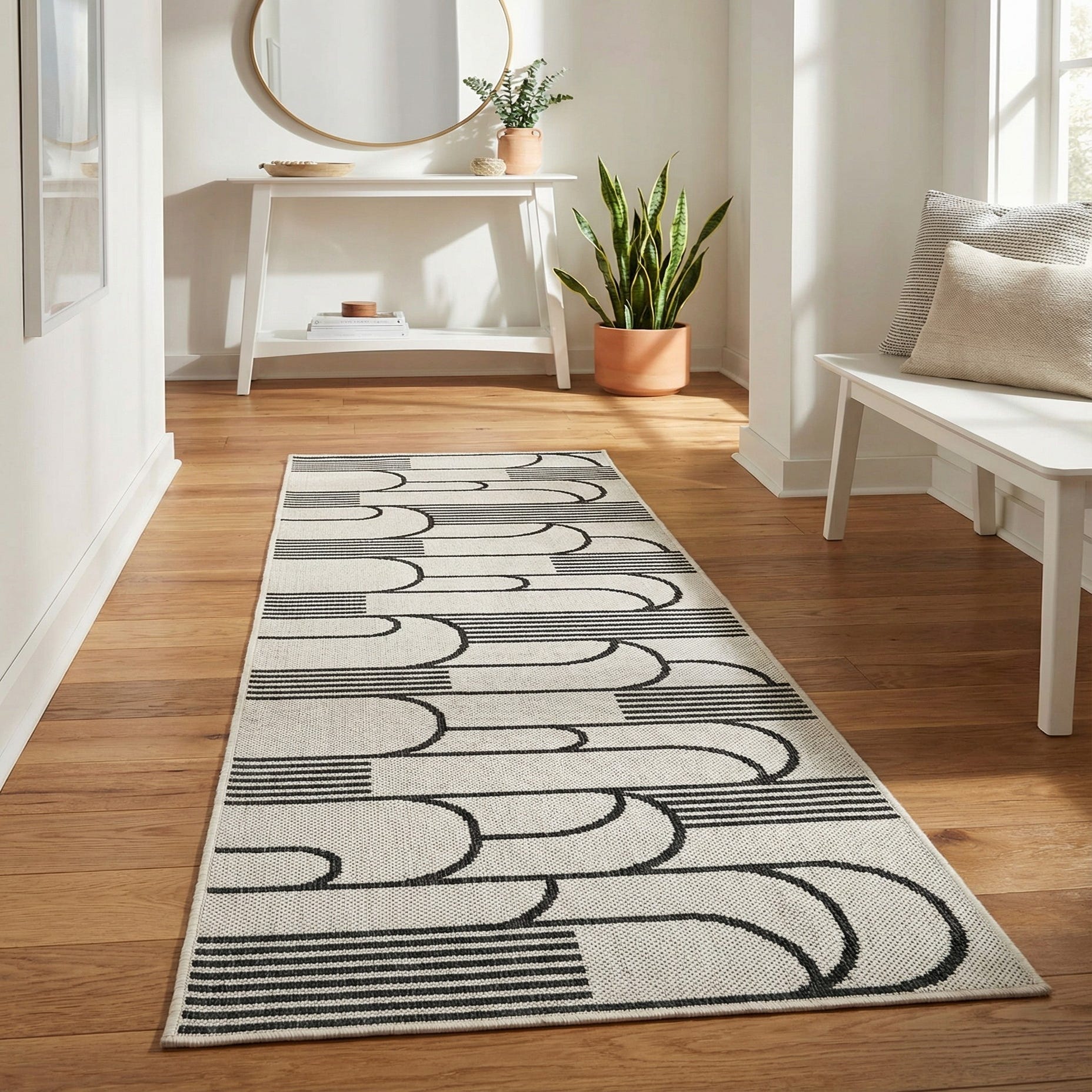 The stark contrast between the white and black lends this runner a striking visual appeal that can anchor spaces with its modern aesthetic. The stain-resistant nature of the rug makes it a practical choice for areas prone to spills or outdoor environments. Since the rug is pet-friendly and shed-free, it caters to worry-free maintenance in homes with animals.