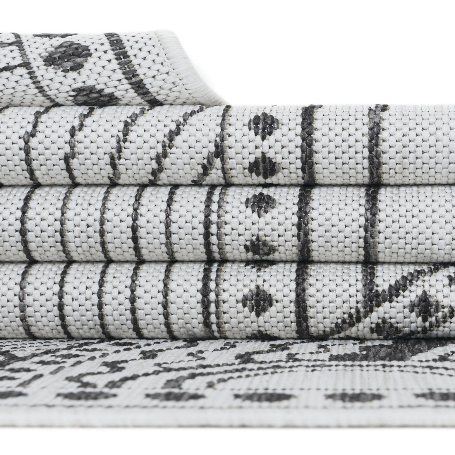 A 6 ft runner rug featuring a black and ivory medallion pattern with geometric and traditional motifs, suitable for indoor/outdoor use.
