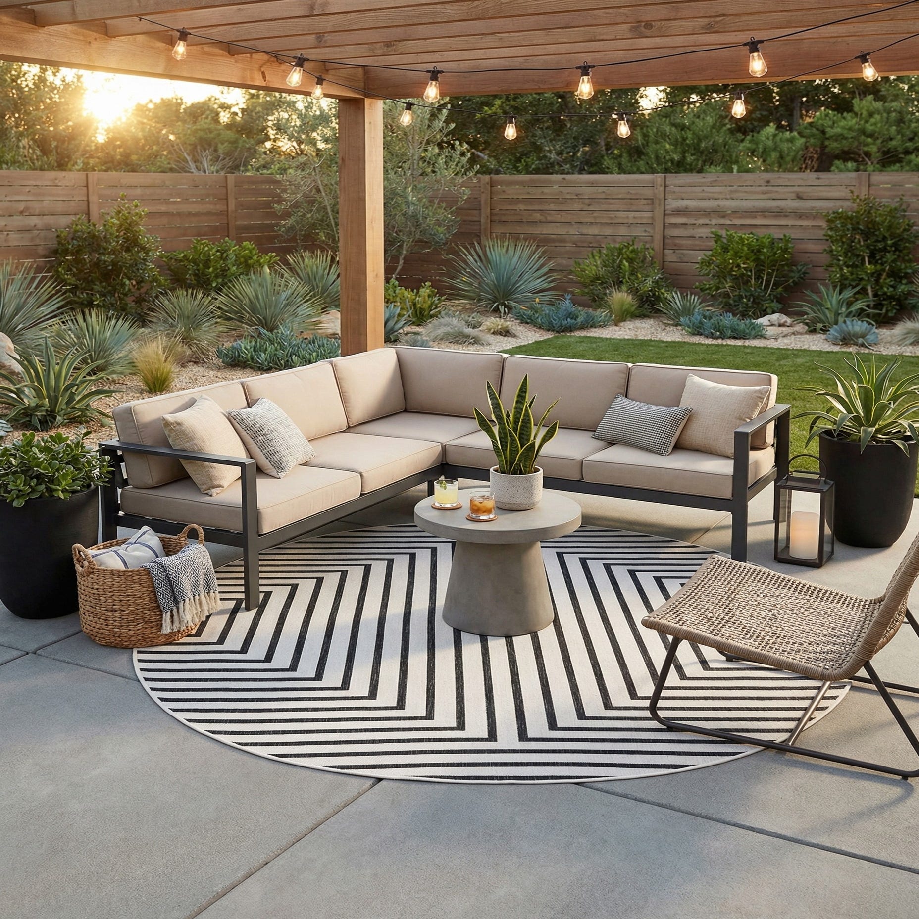 This rug would complement a variety of decors including minimalist, contemporary, and industrial-inspired outdoor spaces. It can seamlessly integrate with monochromatic color schemes or serve as an engaging contrast amidst more vibrant outdoor settings. Ideal for patios, decks, and other open-air environments, this piece is poised to create an inviting and stylish atmosphere.