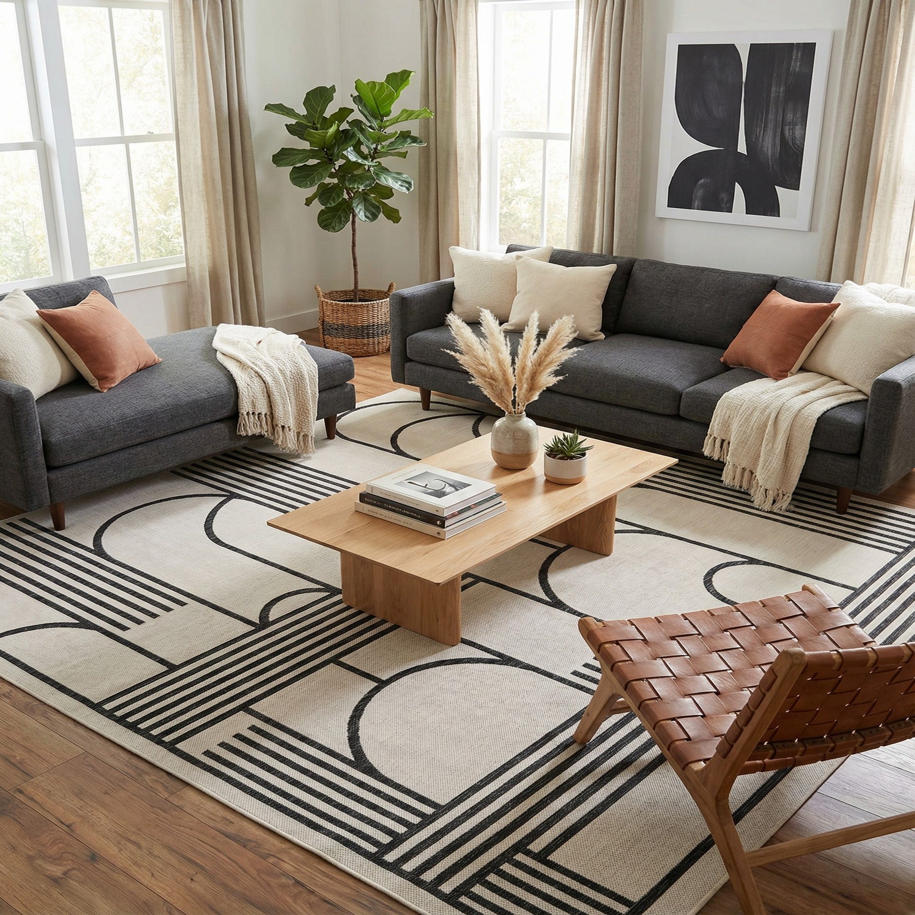 This rug's contemporary design, featuring clean lines and a striking color contrast, makes it an ideal complement to modern outdoor patios, minimalist living rooms, or any space where a touch of graphic visual interest is desired. Additionally, due to its pet-friendly and shed-free nature, this rug is well-suited to households with pets, providing a stylish yet practical floor covering solution.